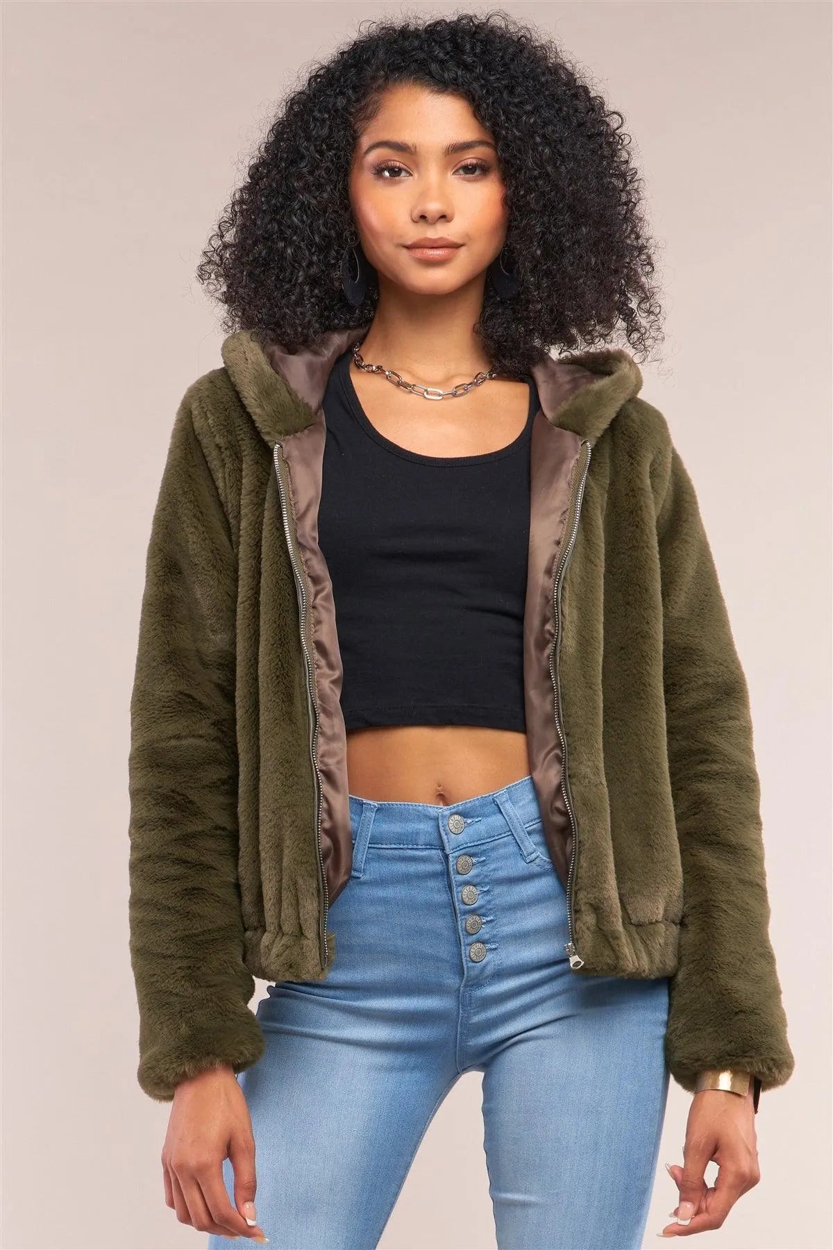 Olive Soft Faux Fur Hooded Zip-Up Jacket /4-2