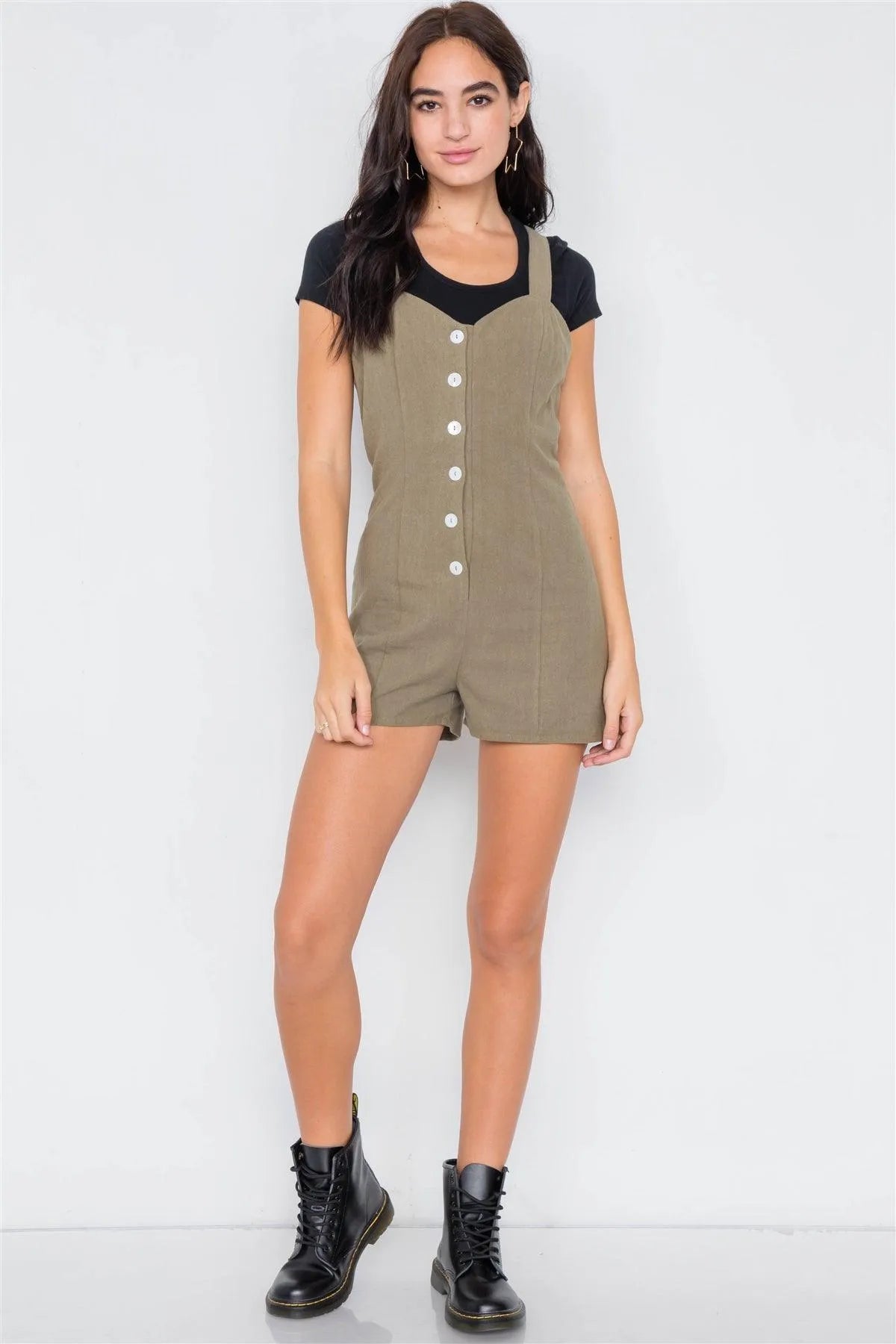 Romper features: sweetheart neck, criss-cross back straps, solid, front button closure, front and back darts, mini length, suede, some stretch, unlined. Model is 5'10" and wearing a Small (Waist: 24", Bust: 32B", Hips: 36")Item Measurements: Length: 31", Bust 32" True to sizeAlso available in Oatmeal