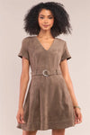 Olive Suede V-Neck Tight Fit D-Ring Buckle Belt Detail Mini Dress /1-2-2-1