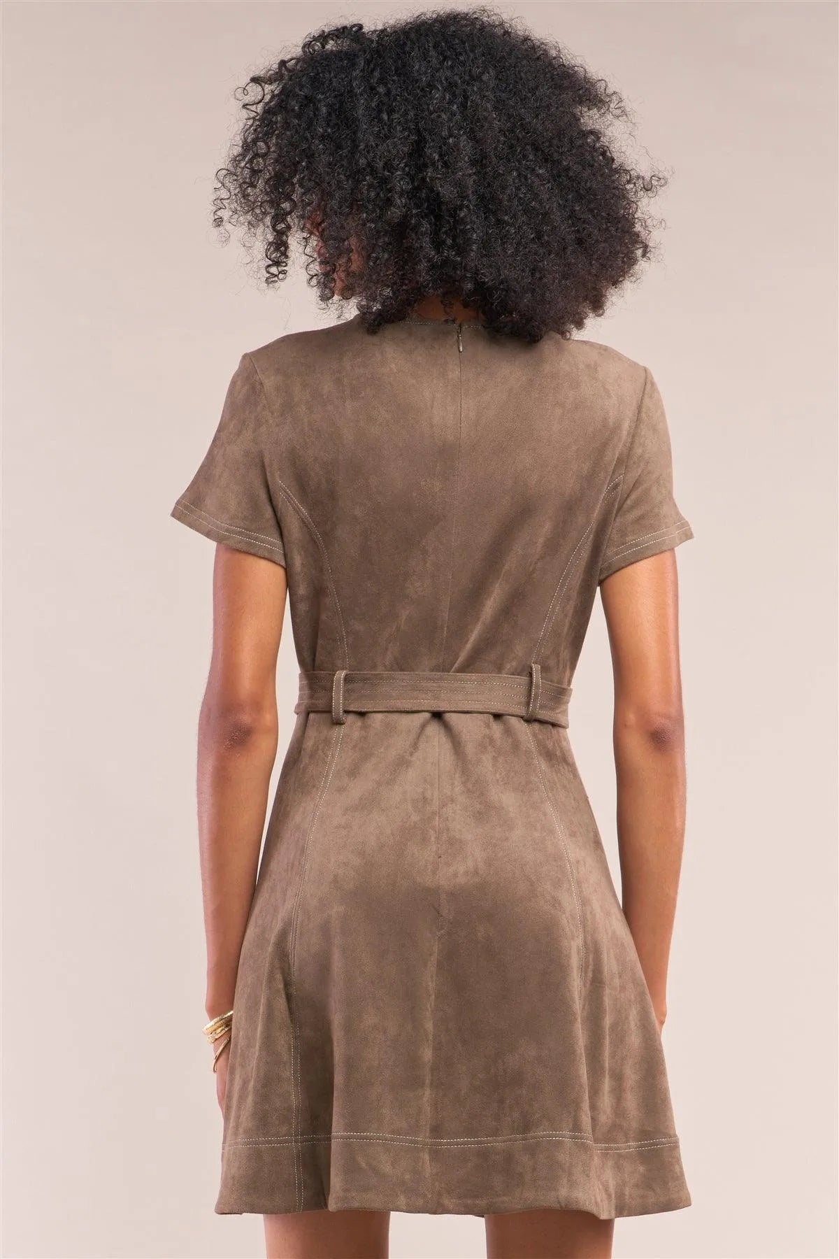 🖤 Item Features: Olive, solid, suede, V-neckline, short sleeve, tight fitting, white stitched detachable D-ring buckle belt detail, back zipper closure, two sewed decorative side pockets, flare bottom, mini length, unlined, stretchy, casual, soft to touch, stylish, trendy, fall/winter collection