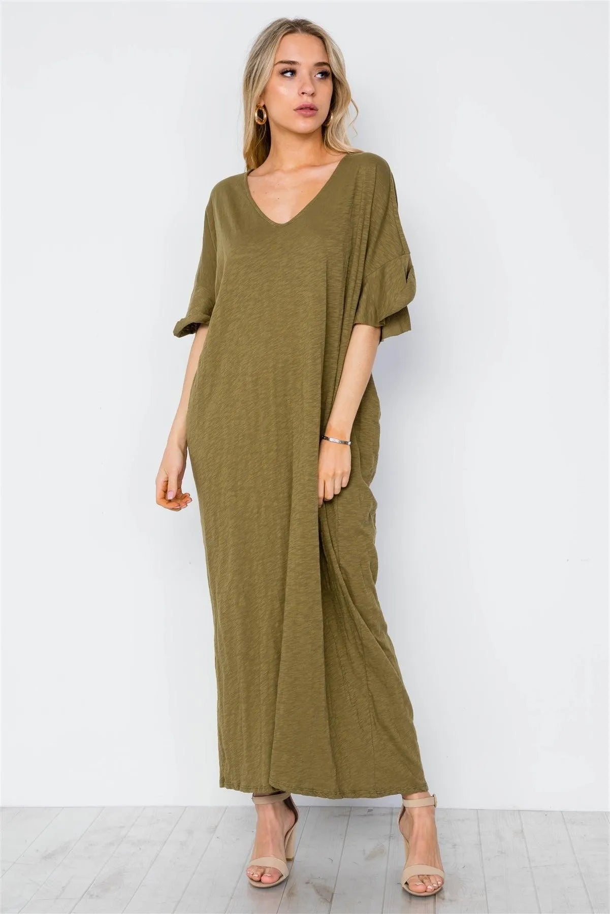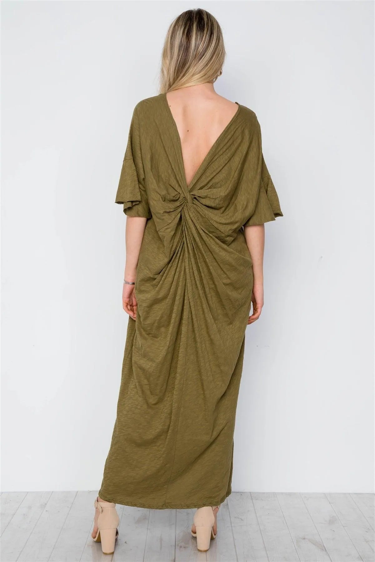 Olive Twist Back Short Sleeve Maxi Boho Shirt Dress /2-2-2