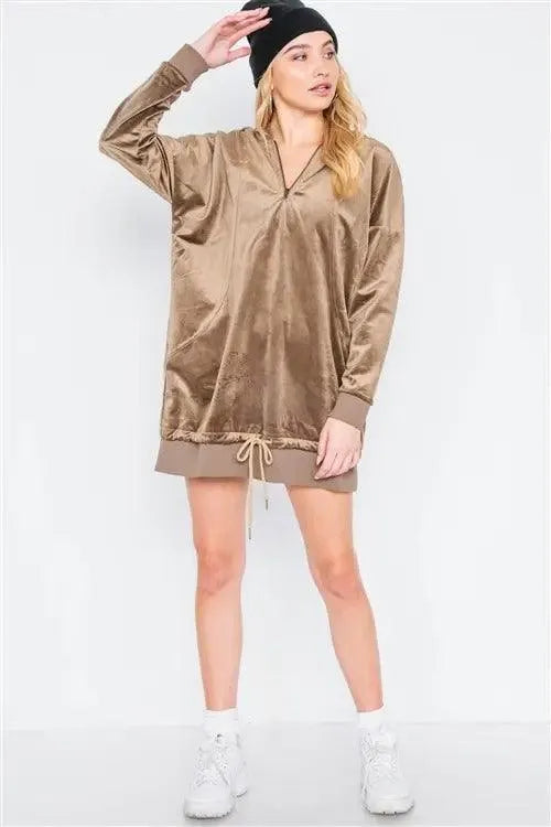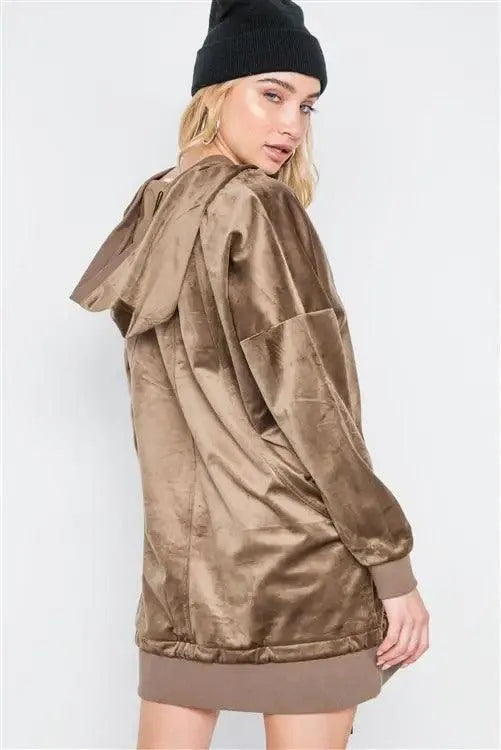 🖤Item features: Olive mocha, solid color, velvet, long sleeves, hooded, partly front-zip closure, ribbed trim, dropped shoulders, drawstring at hem, unlined, non-stretchy, oversized fit, mini length, casual, basic, stylish, perfect everyday piece, must have