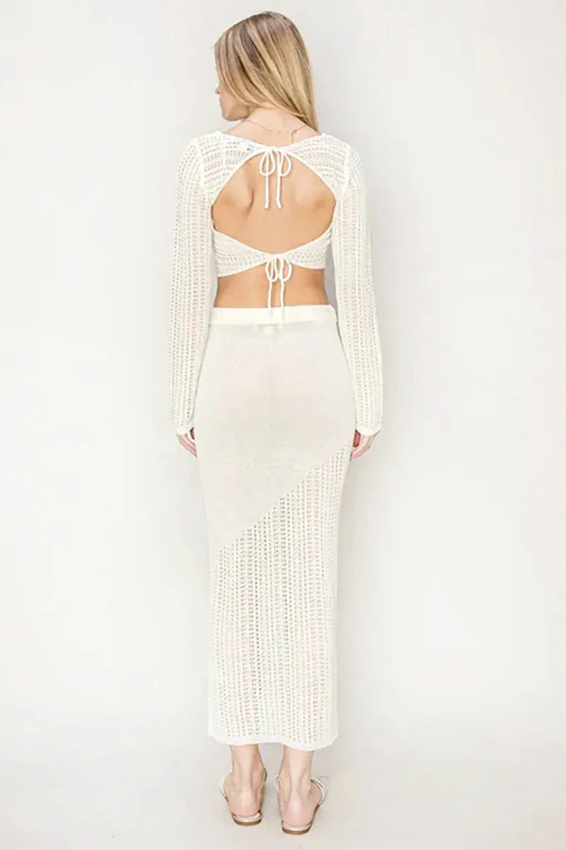 Open-Back Crochet Knit Tie Two-Piece Crop Top and Midi Skirt Set