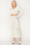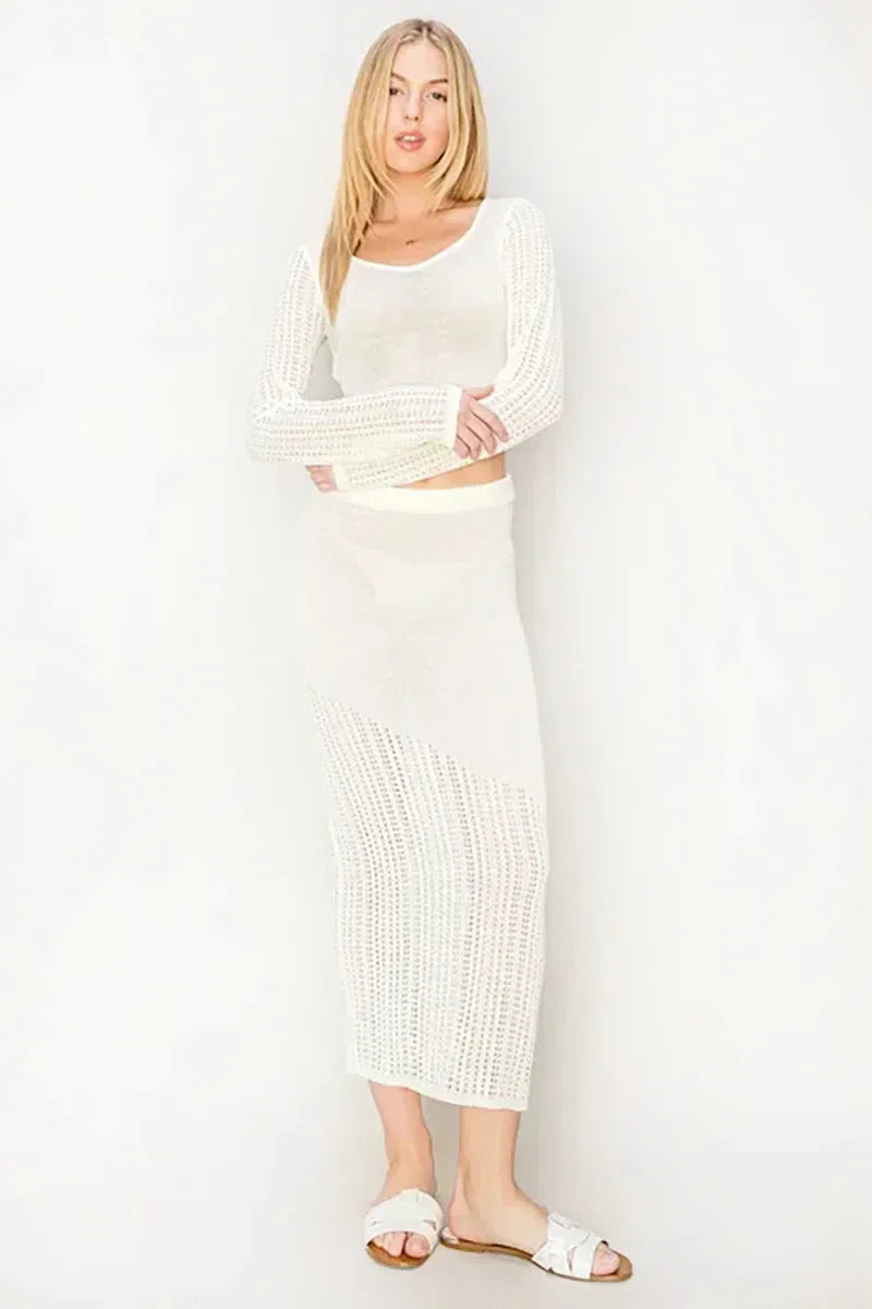 🖤 Features: Textured open crochet design, scoop neckline, long fitted sleeves, crop top length, open tie-back detail, high-rise skirt with elastic waistband, semi-sheer paneled skirt construction, midi length, stretchy comfortable fit