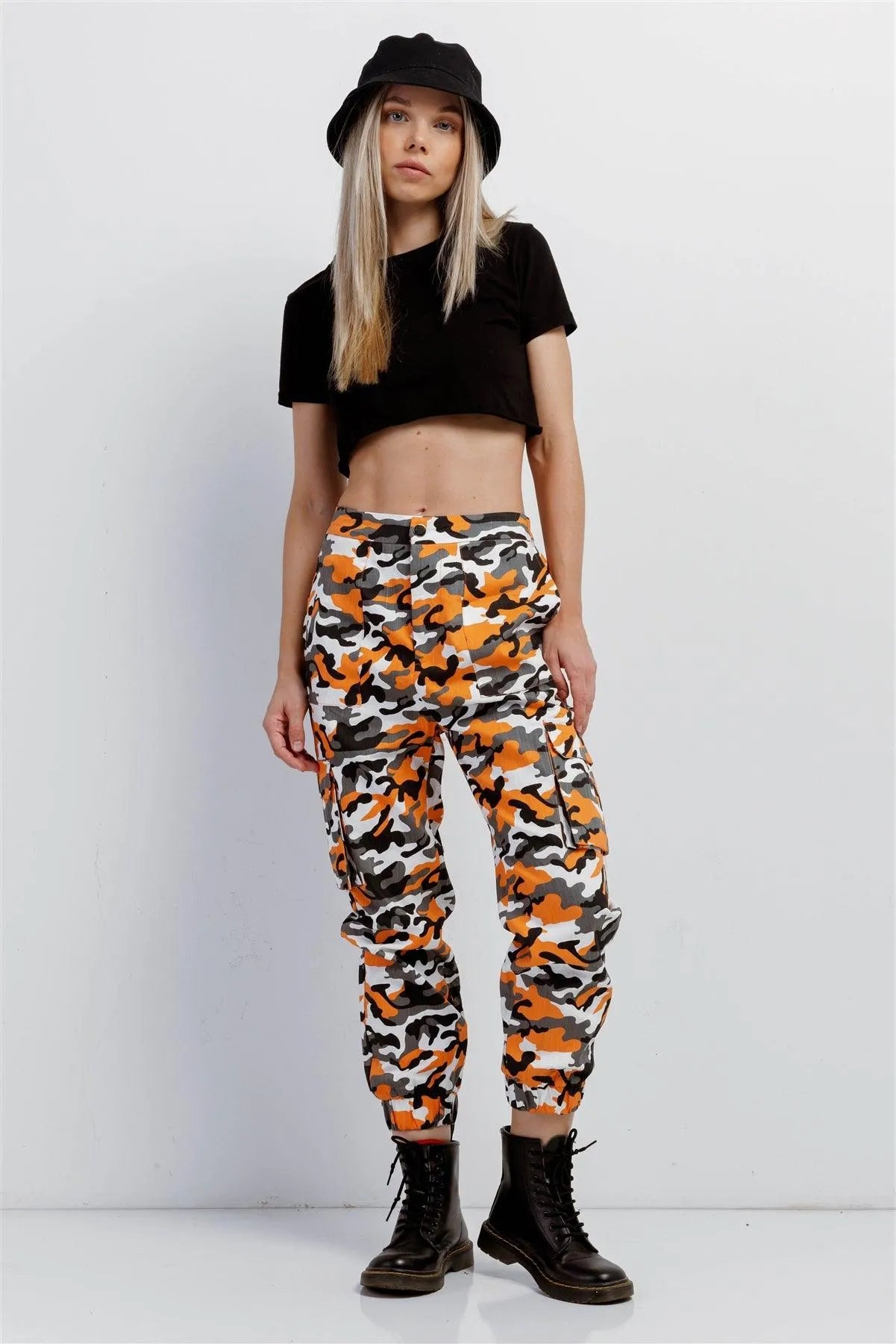 🖤 Item features: Camouflage print, orange, white, grey, black, high waisted, semi-stretchy, elastic leg hem, unlined, front pockets, two big cargo pockets, silver button closure, fly zip.