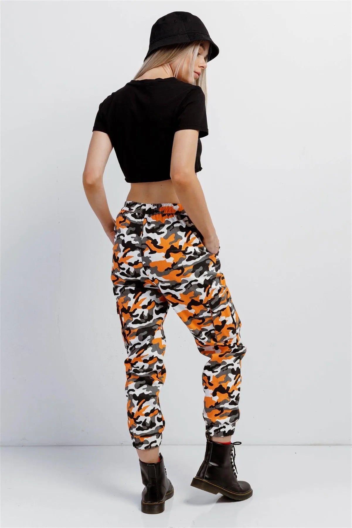 🖤 Take on any challenge with these bold Orange Camouflage High Waisted Cargo Pants! The semi-stretchy construction and high waist provide comfort and style, while the elastic leg hem and numerous pockets offer practicality and an edgy touch. Perfect for the risk-taker in you!