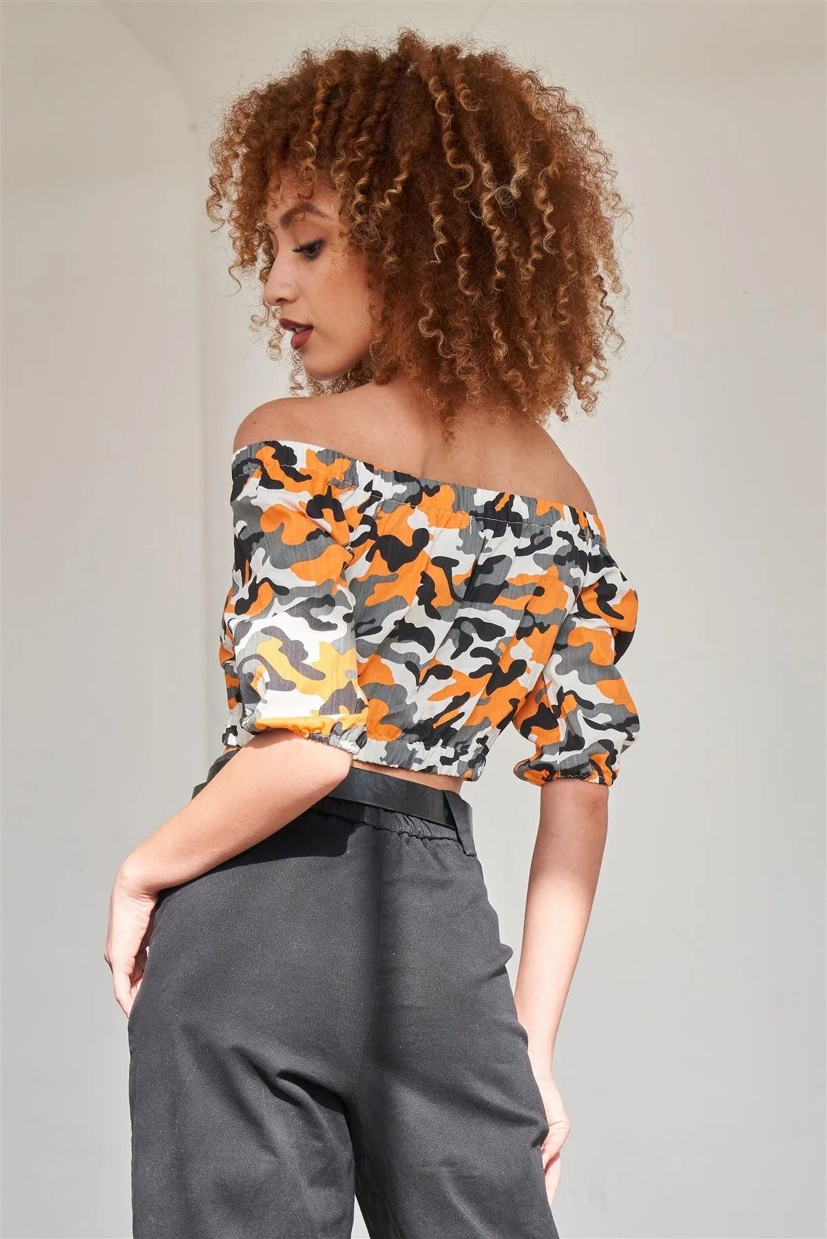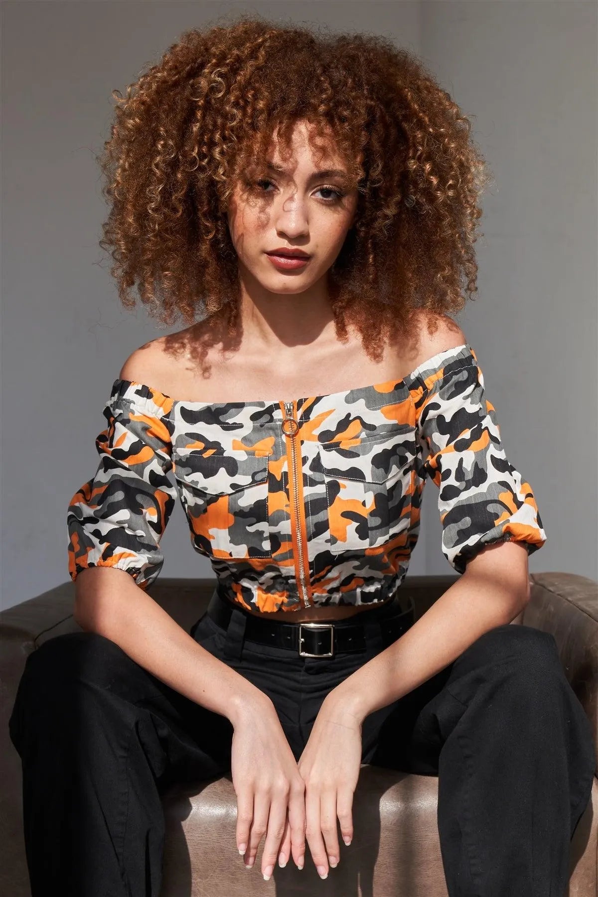 Orange Zipper Front Off The Shoulder Cargo Pocket Camouflage Print Crop Top /2-2-2