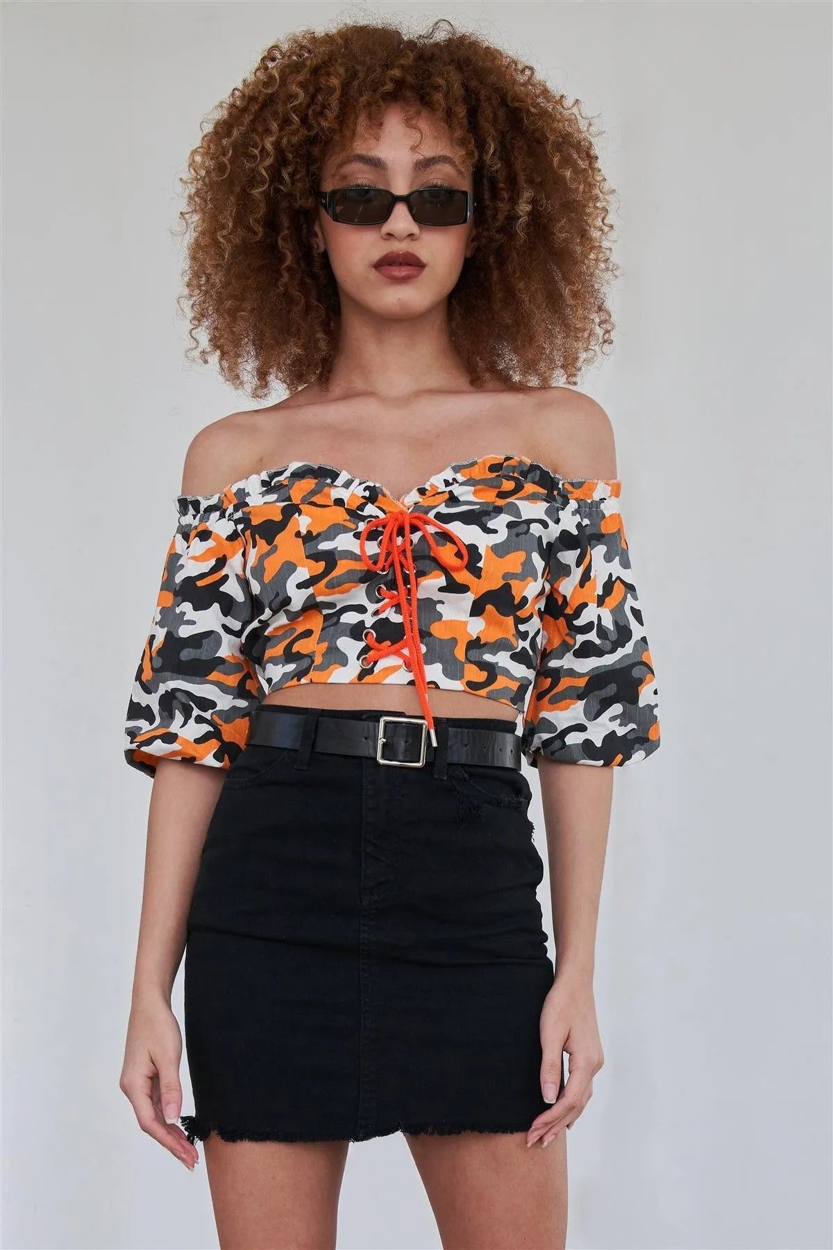 Orange Camo Off The Shoulder Puff Sleeve Crop Top