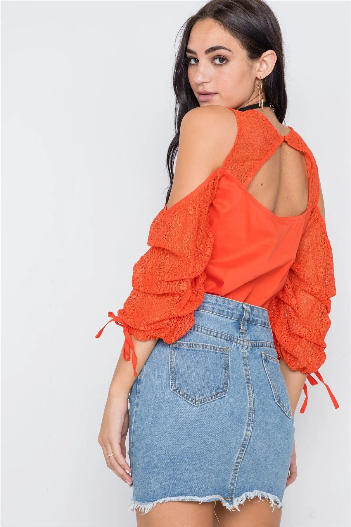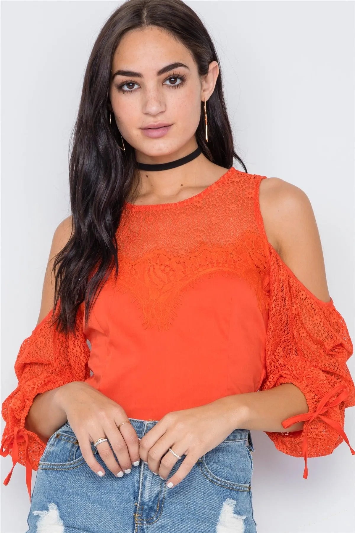 Orange Cold Shoulder Puff Sleeves Lace Combo Top /2-2-2