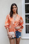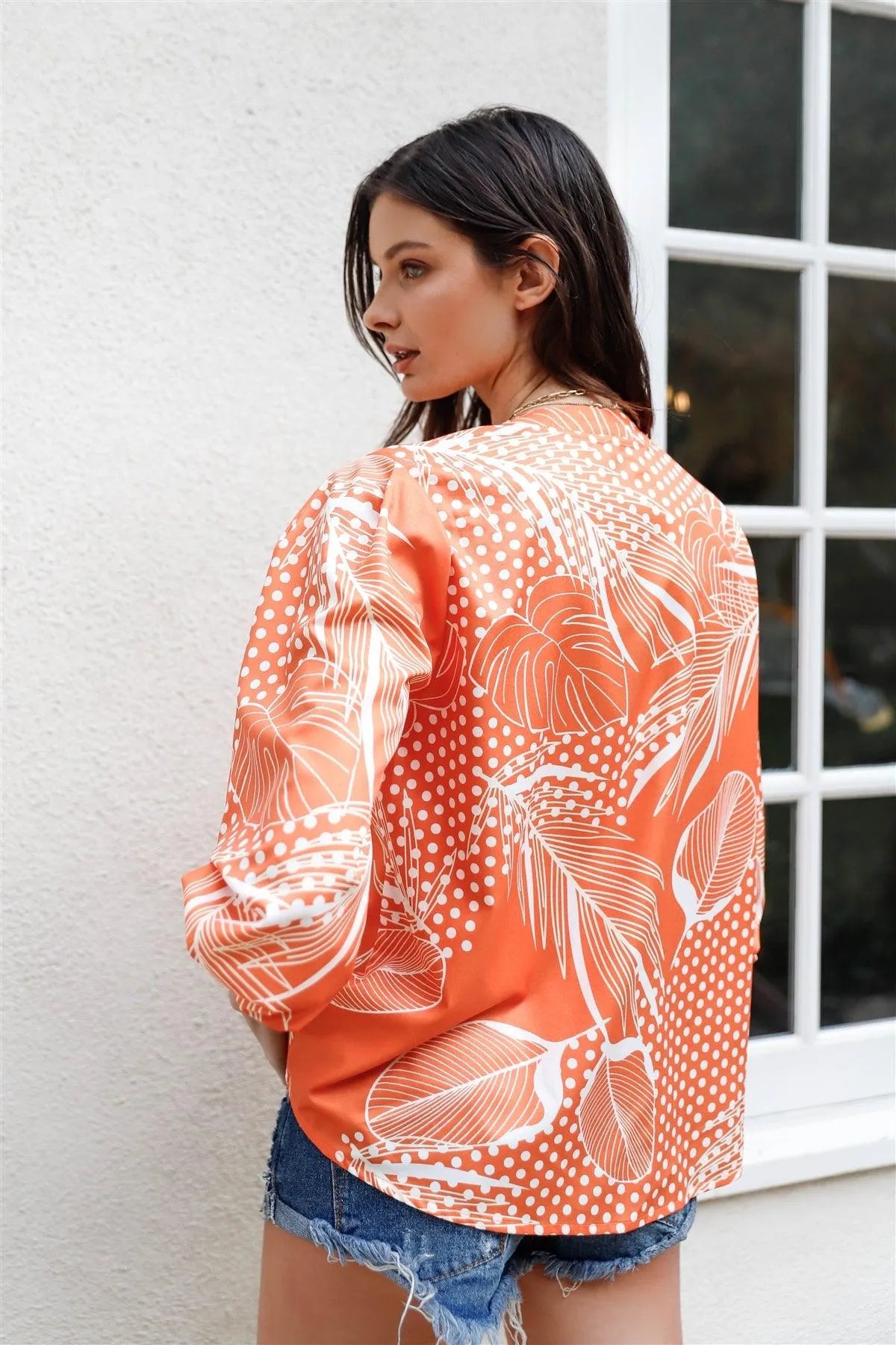 Orange Polka Dot Leaves Print Button Up Detail Balloon Sleeve Top /2-2-1