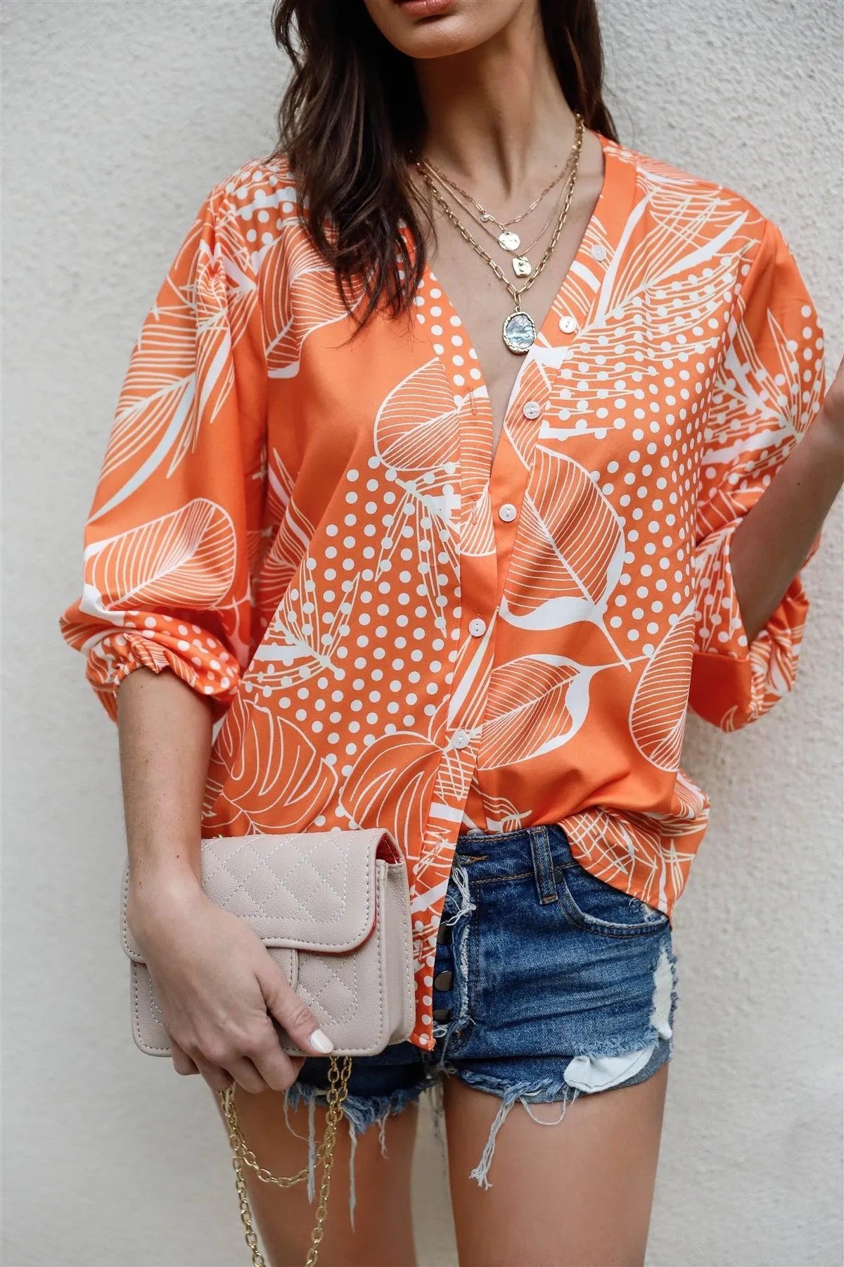 🖤 Item features: Orange, polka dot & leaves print, button up front closure detail, puff balloon midi sleeves, v-neckline, relaxed fit, non-stretchy, non-sheer, unlined, casual, trendy, stylish, spring/summer look