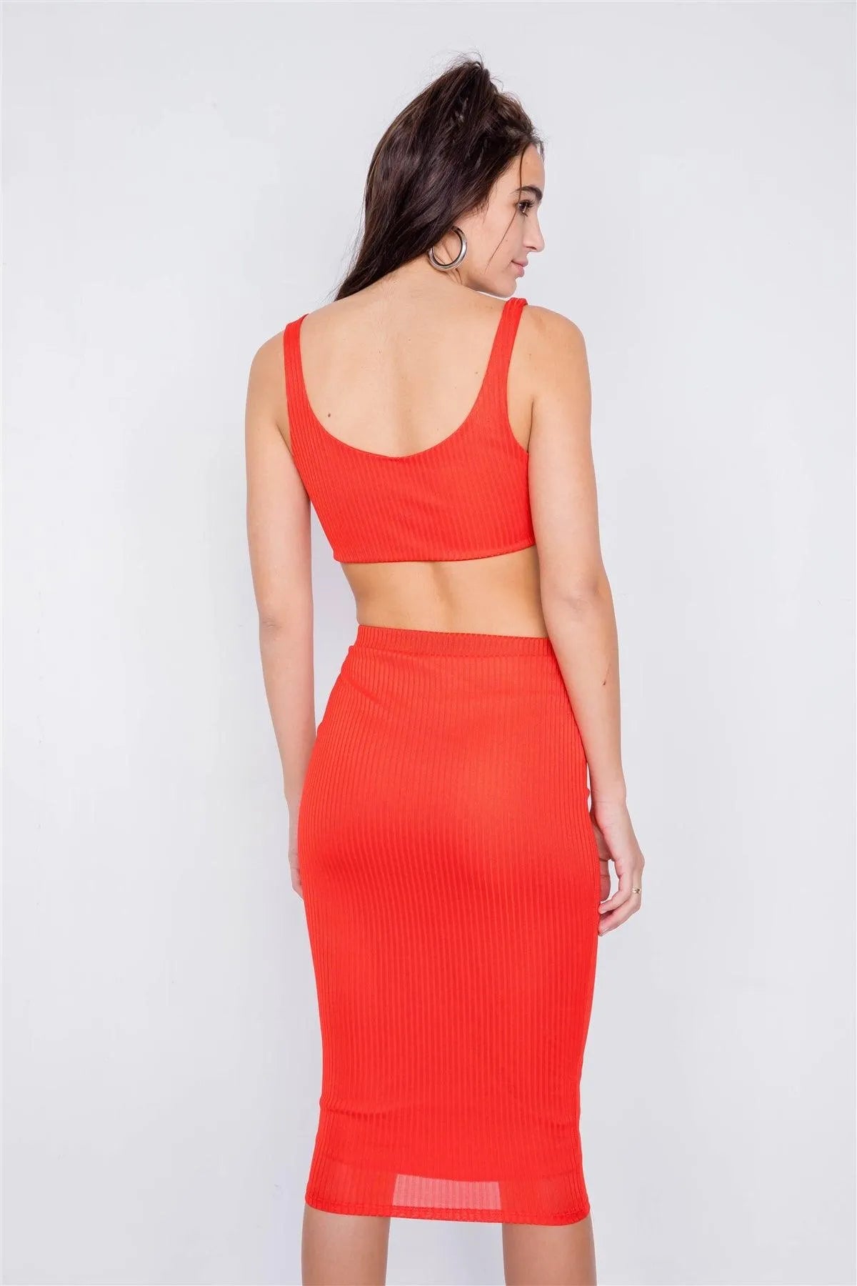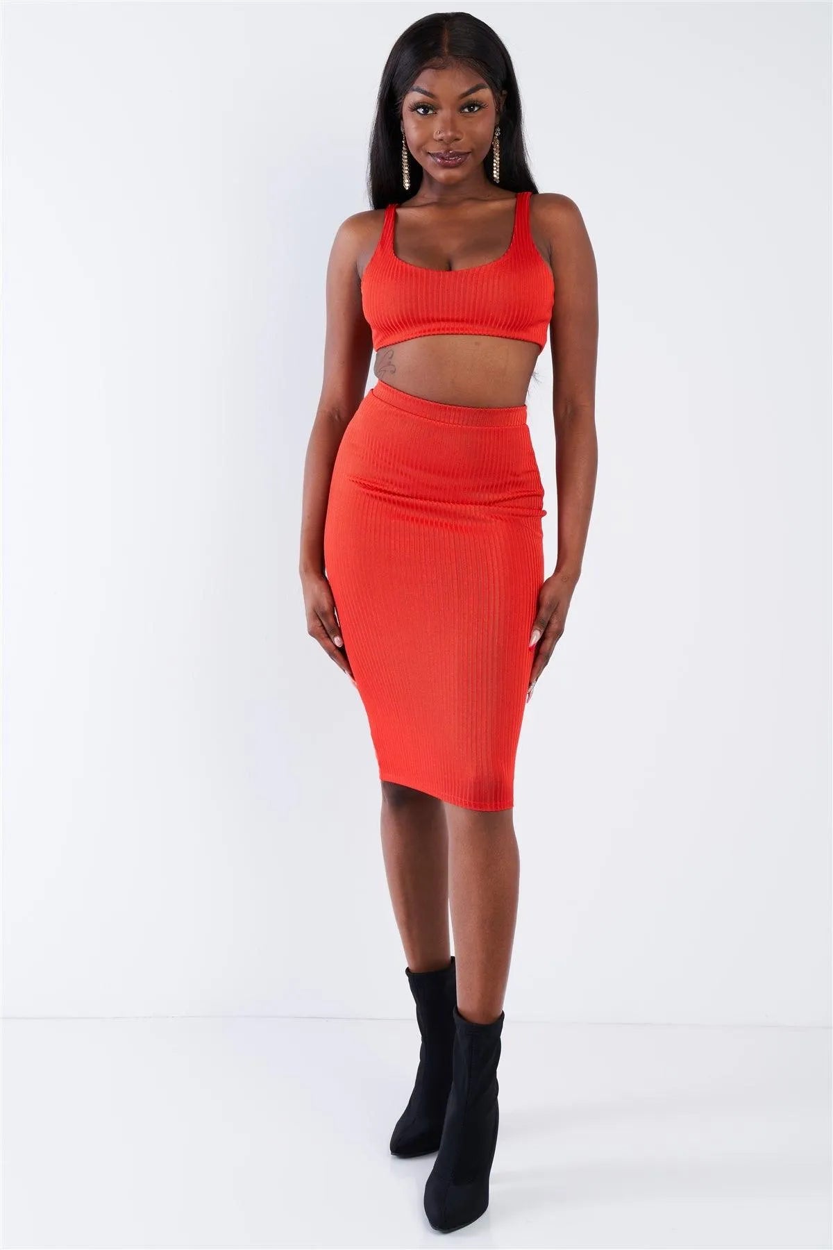 Orange Ribbed Square Neck Crop Top & Mini Bodycon Skirt Set /3-2-1
