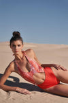 🖤 Item Features: Deep orange & snakeskin print combo, self-tie halter V-neckline, open back, self-tie back and neck straps, cut-out front, high-leg fit, one-piece, lined, stretchy, festival wear, color pop, sexy, spring/summer swimsuit collection