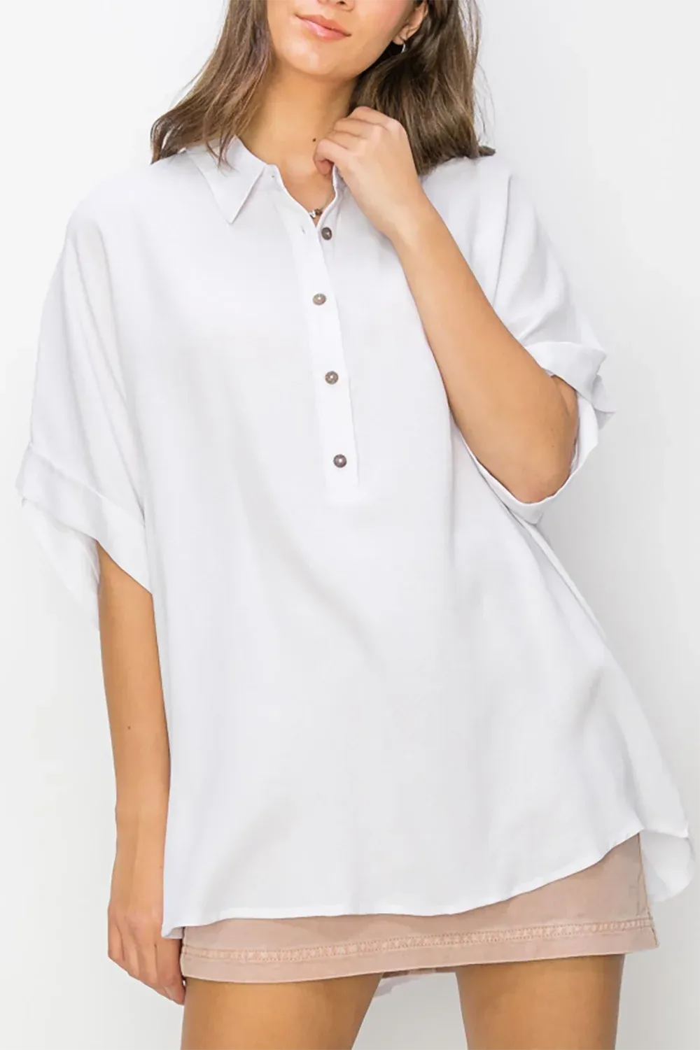 Oversized Button-Down Collared Short Sleeve Polo Top