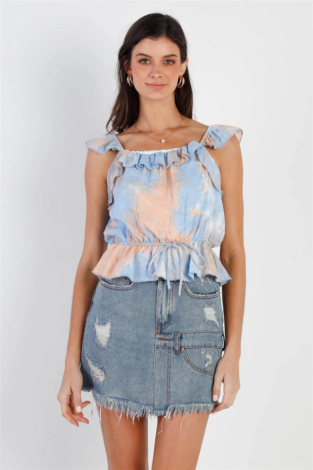 Peach Blue Tie-Dye Ruffle Trim Waist Self-Tie Detail Top /1-2-2