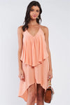 Peach Asymmetrical Sleeveless Deep Plunge V-Neck Layered Flowy Self-Tie Back T-Shaped Halter Neck Tie Mini Dress