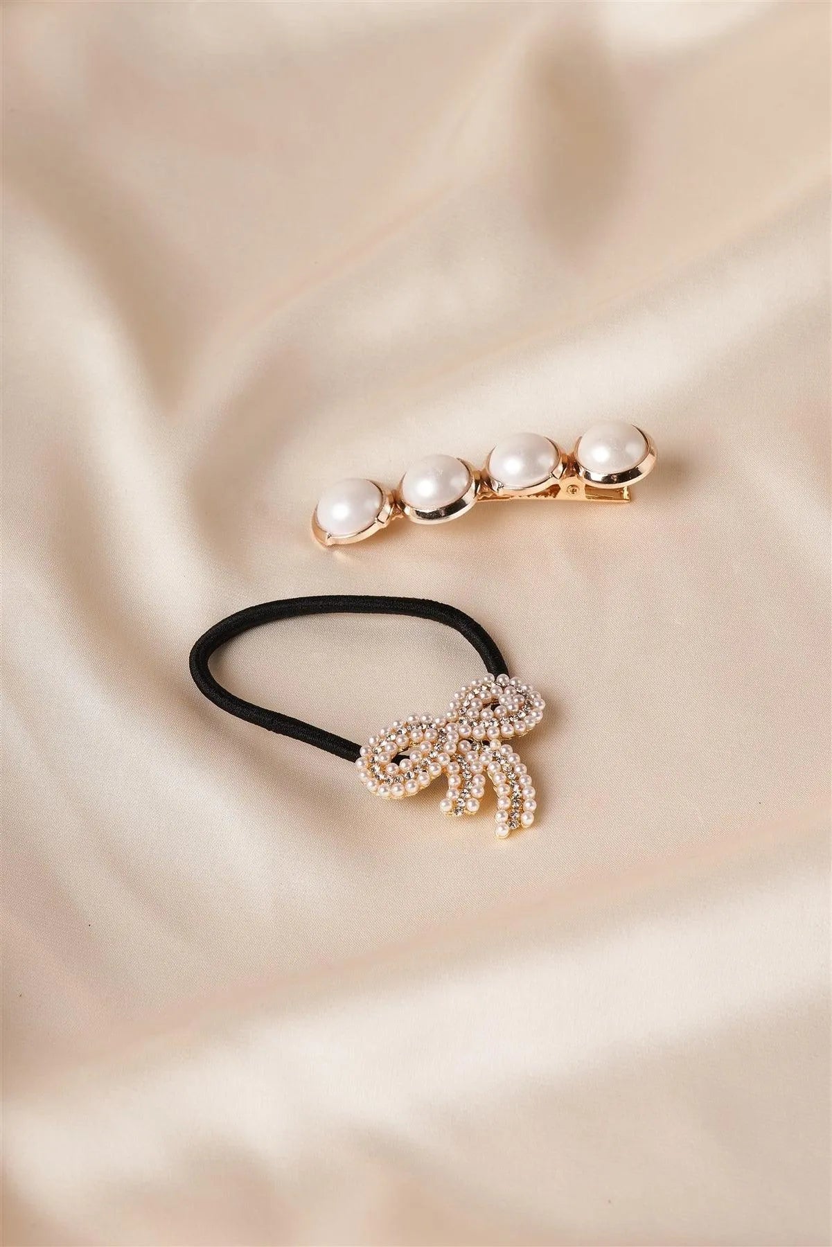 Pearl Bow Tie Hair Tie with Gold Pearl Hair Clip - Set of 2