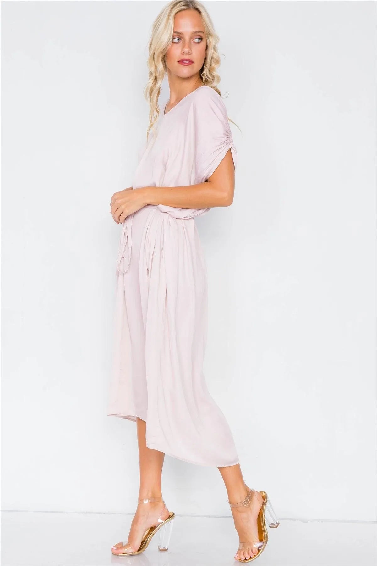 Dress features: cinched shoulders, belt loop, waist tie, midi length, solid, v-neckline, back v-neck cinched back, relaxed fit, two side hidden, high-low hem, unlined. Model is 5'8 and wearing a Small ( Bust: 32B", Waist: 25", Hips: 35.5")Item Measurements: Length: 50", Bust 46"True to size Also available in Olive Grey