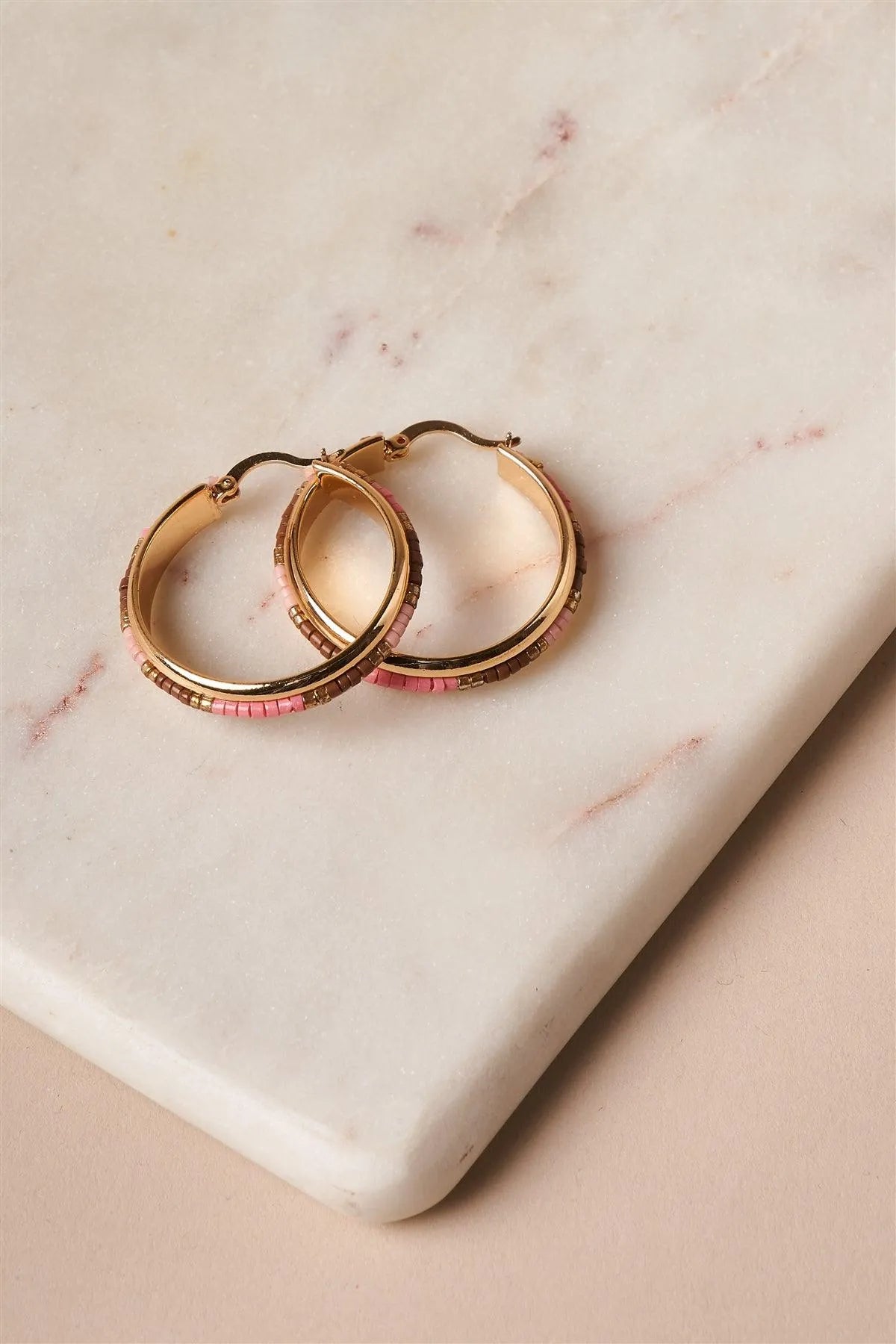 Pink And Brown Beaded Accent Gold Hoop Earrings /1 Pair