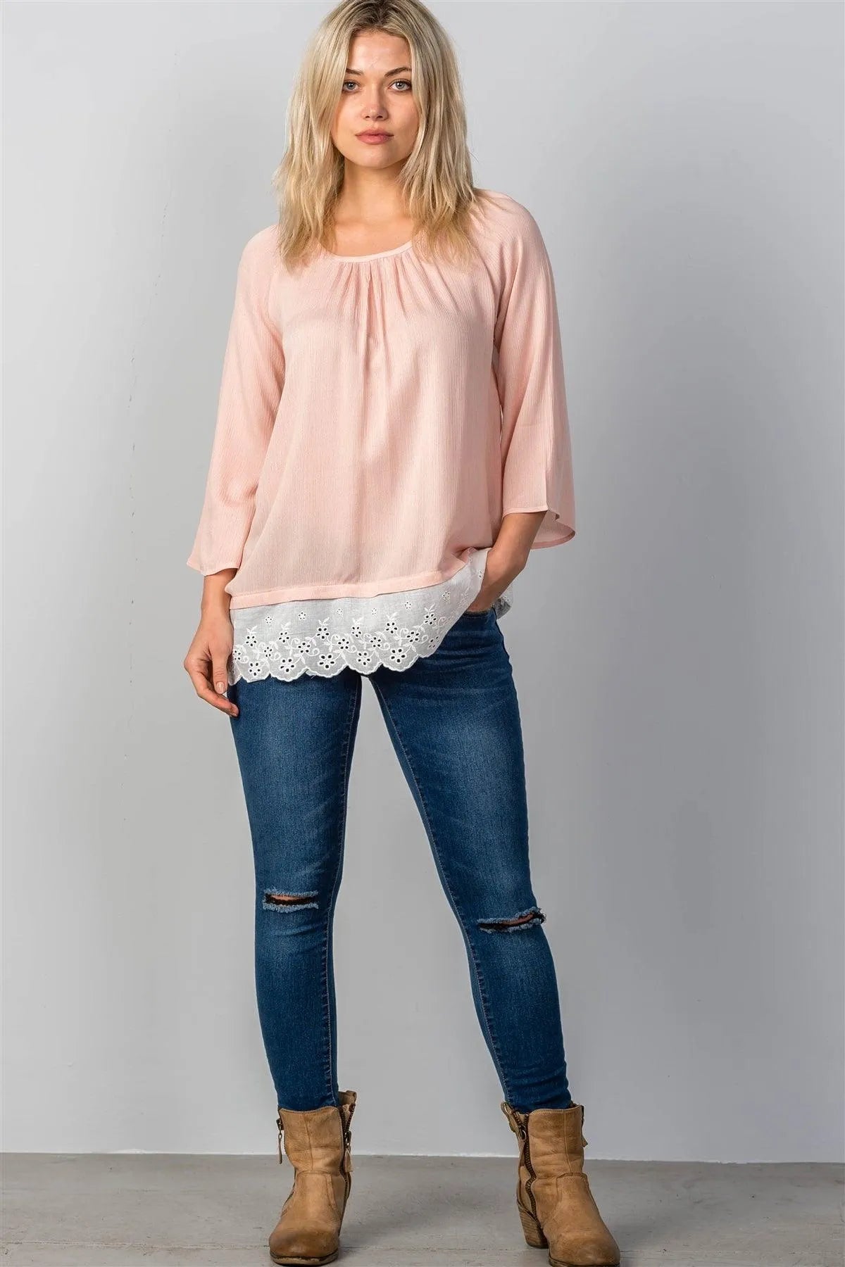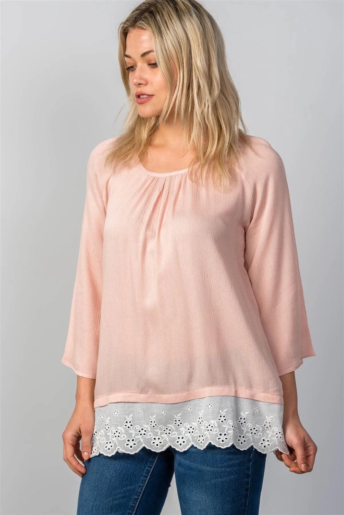Top features: semi-sheer, eyelet contrast hem, color-block, round neckline, 3/4 sleeves, relaxed fit.Model is 5'6 wearing a size Small ( Waist: 26", Bust: 33A, Hips: 36")Item measurements: Length: 28", Bust: 38"