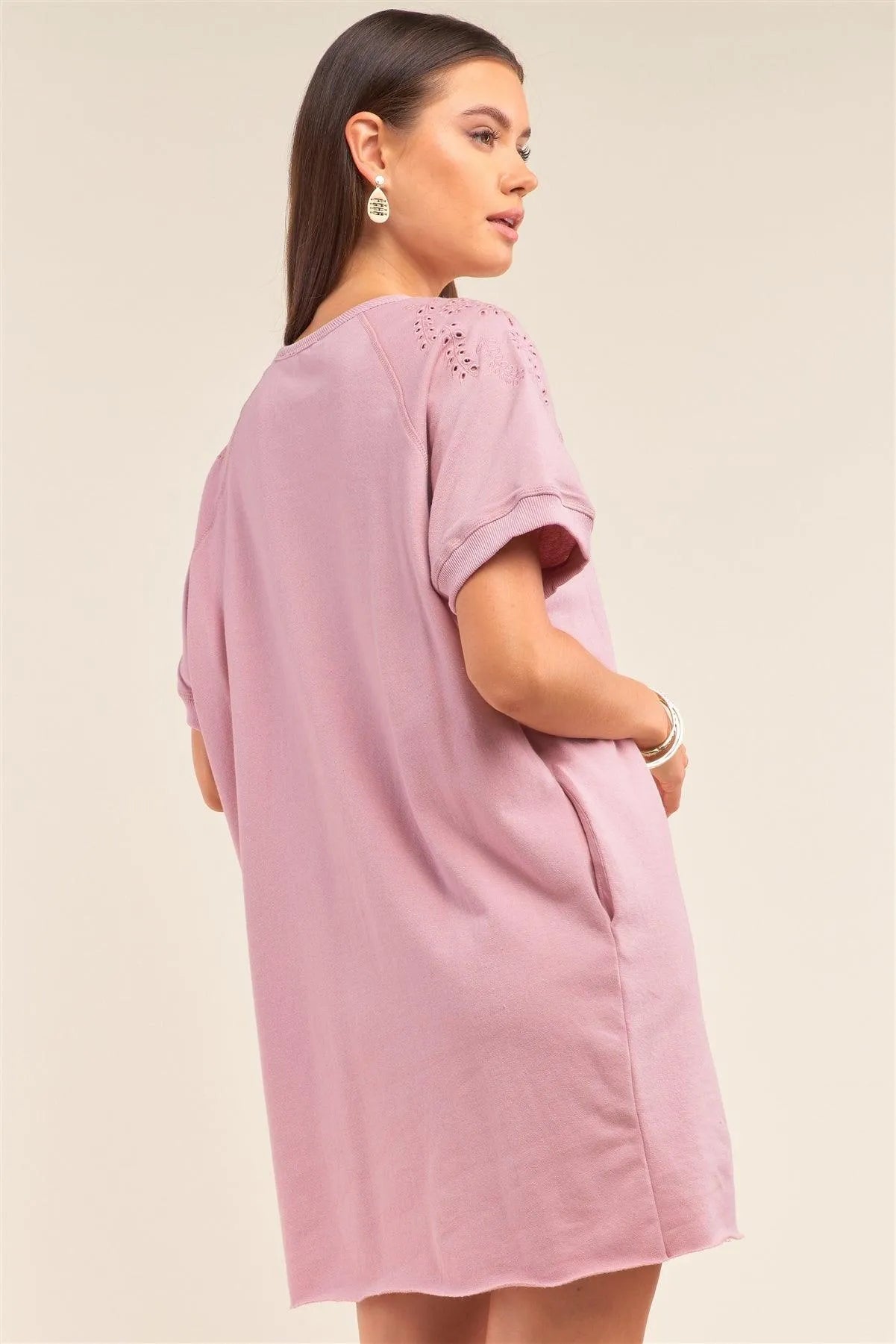 🖤 Item Features: Dusty blush pink, eyelet embroidery chest and shoulder detail, short cuffed sleeve, ribbed hem crew neckline, raw bottom hem detail, T-shirt style dress, mini length, loose fitting, stretchy, unlined, thick fabric, warm, cozy, lounge wear, casual, comfy, cute, fall/winter season