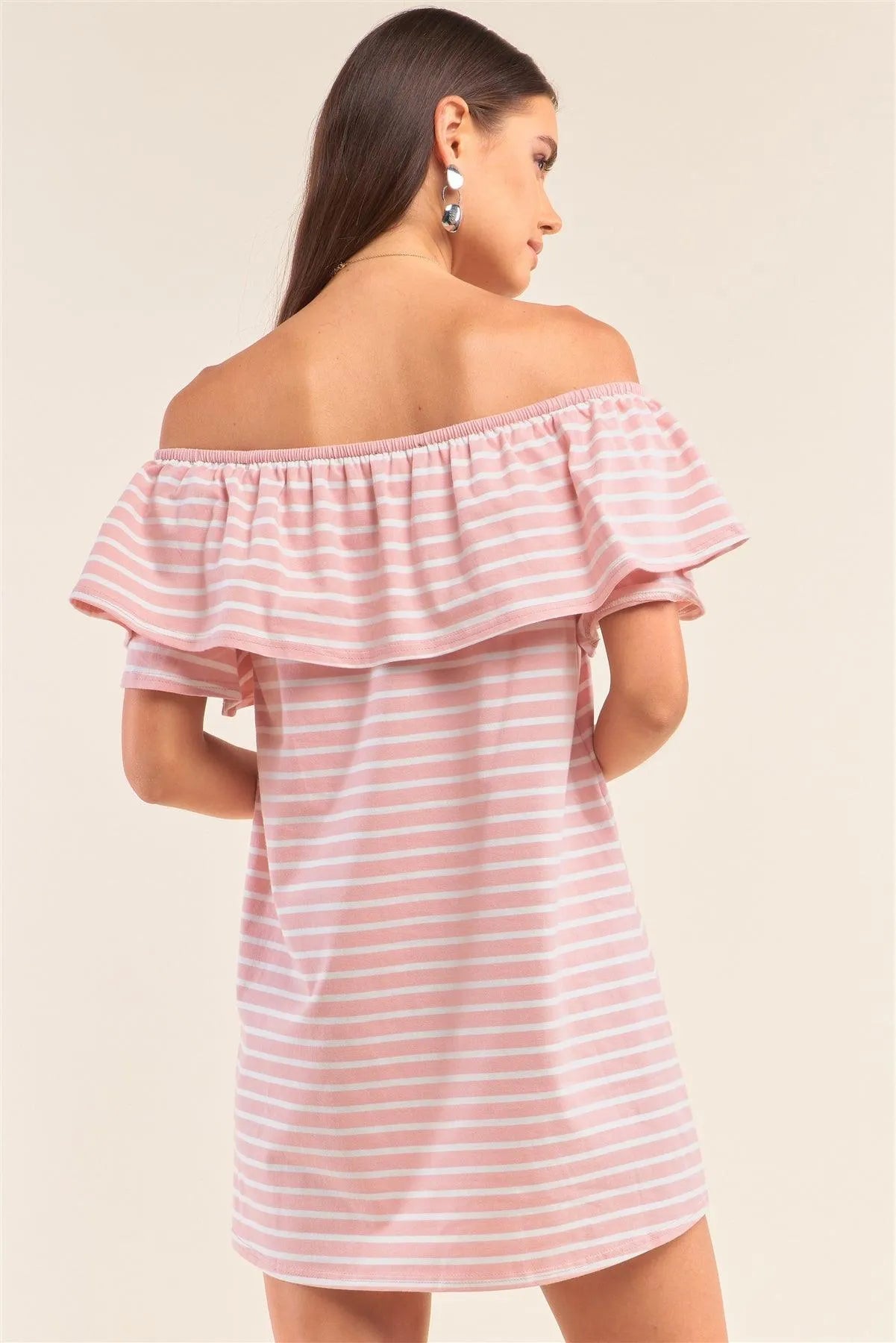 Pink&Ivory Striped Relaxed Fit Off-The-Shoulder Flare Hem Mini Dress /1-2-2-1