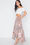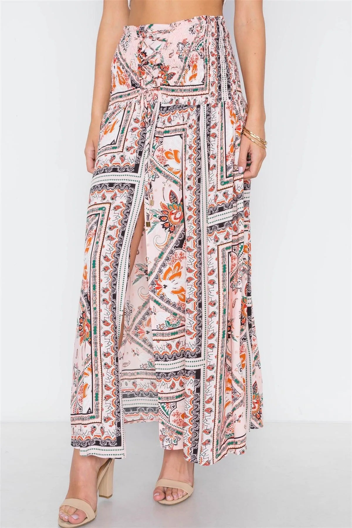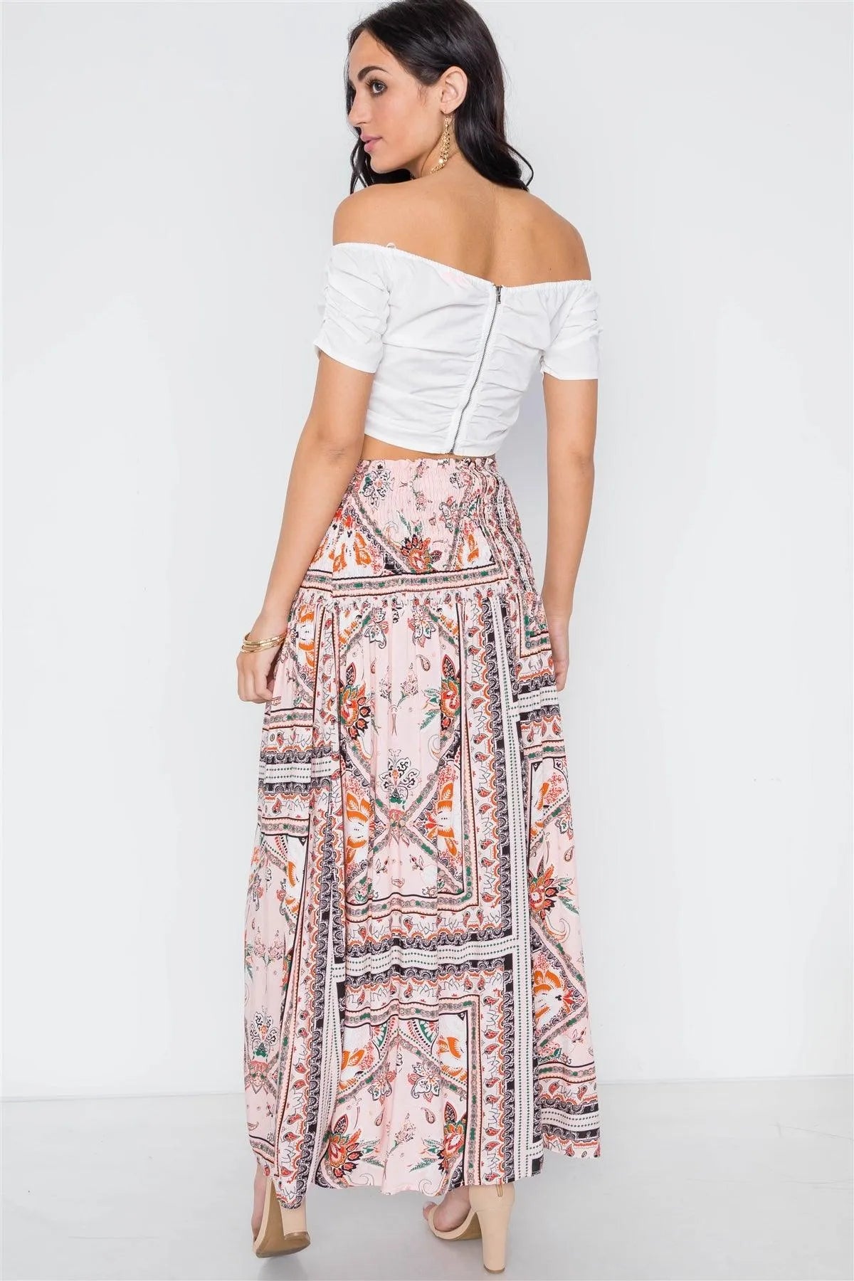 Pink Multi Print Smocked Waist Front Slit Maxi Skirt /1-3-2-1
