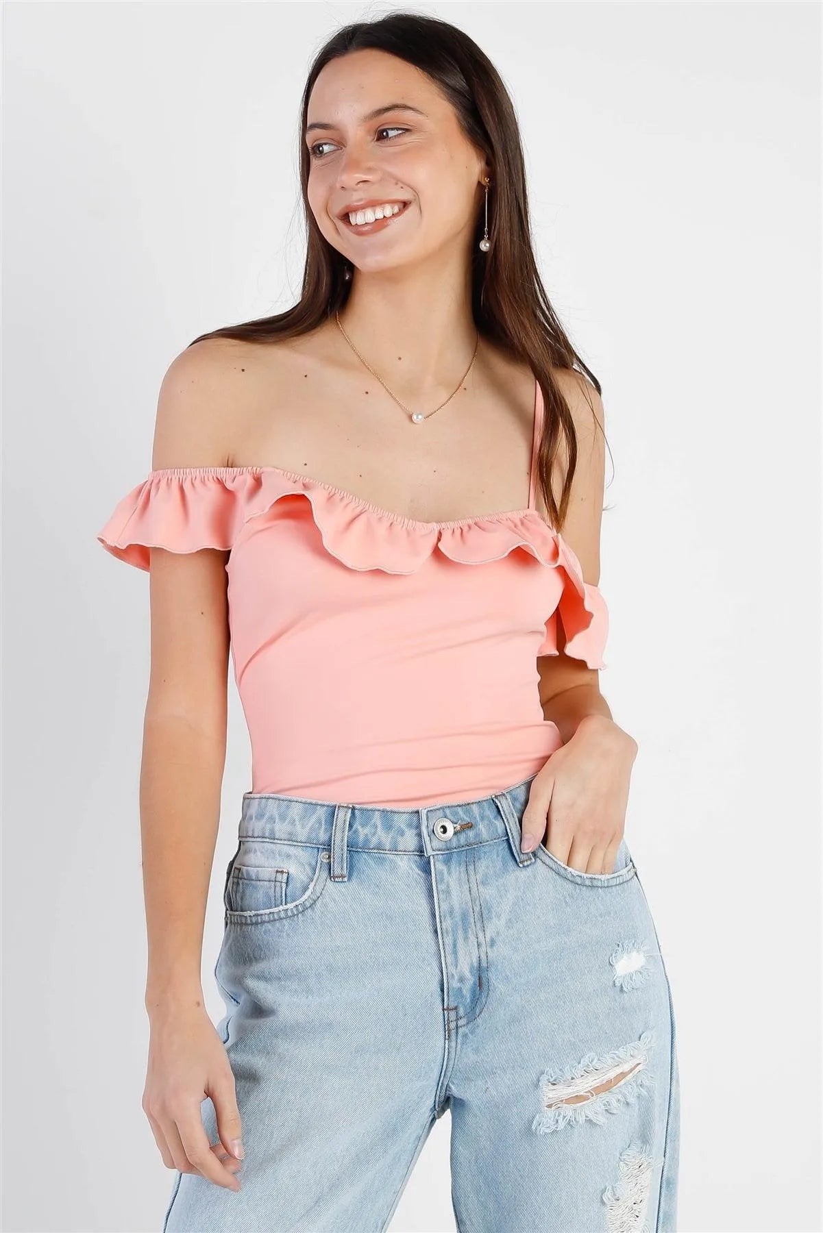 Pink Off-The Shoulder Ruffle Trim Asymmetric Bodysuit /3-2-1