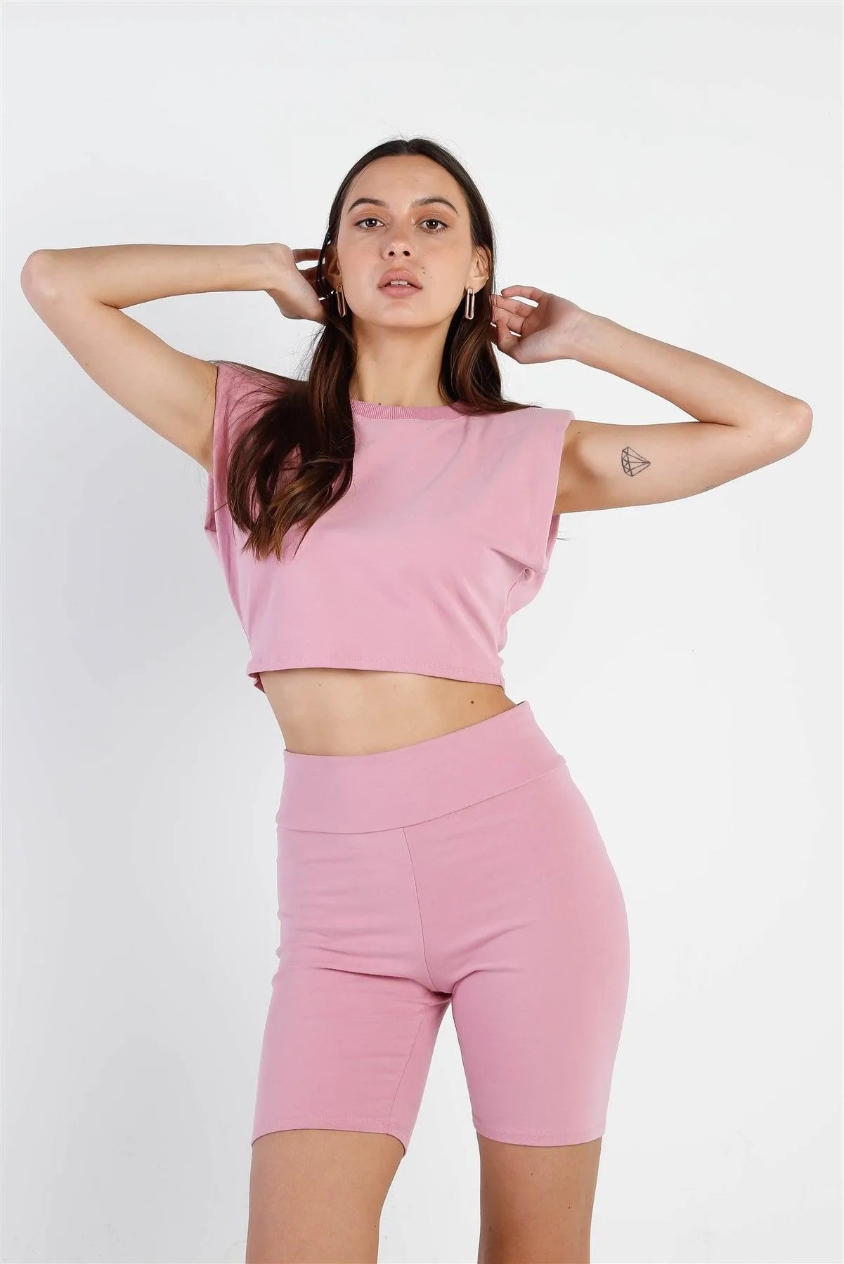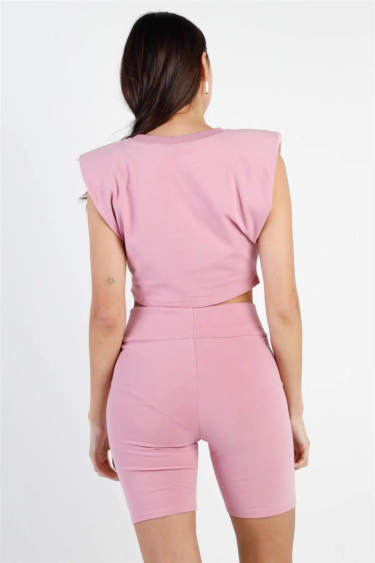 Pink Padded Shoulder Crop Top & Biker Short Set /2-2-2