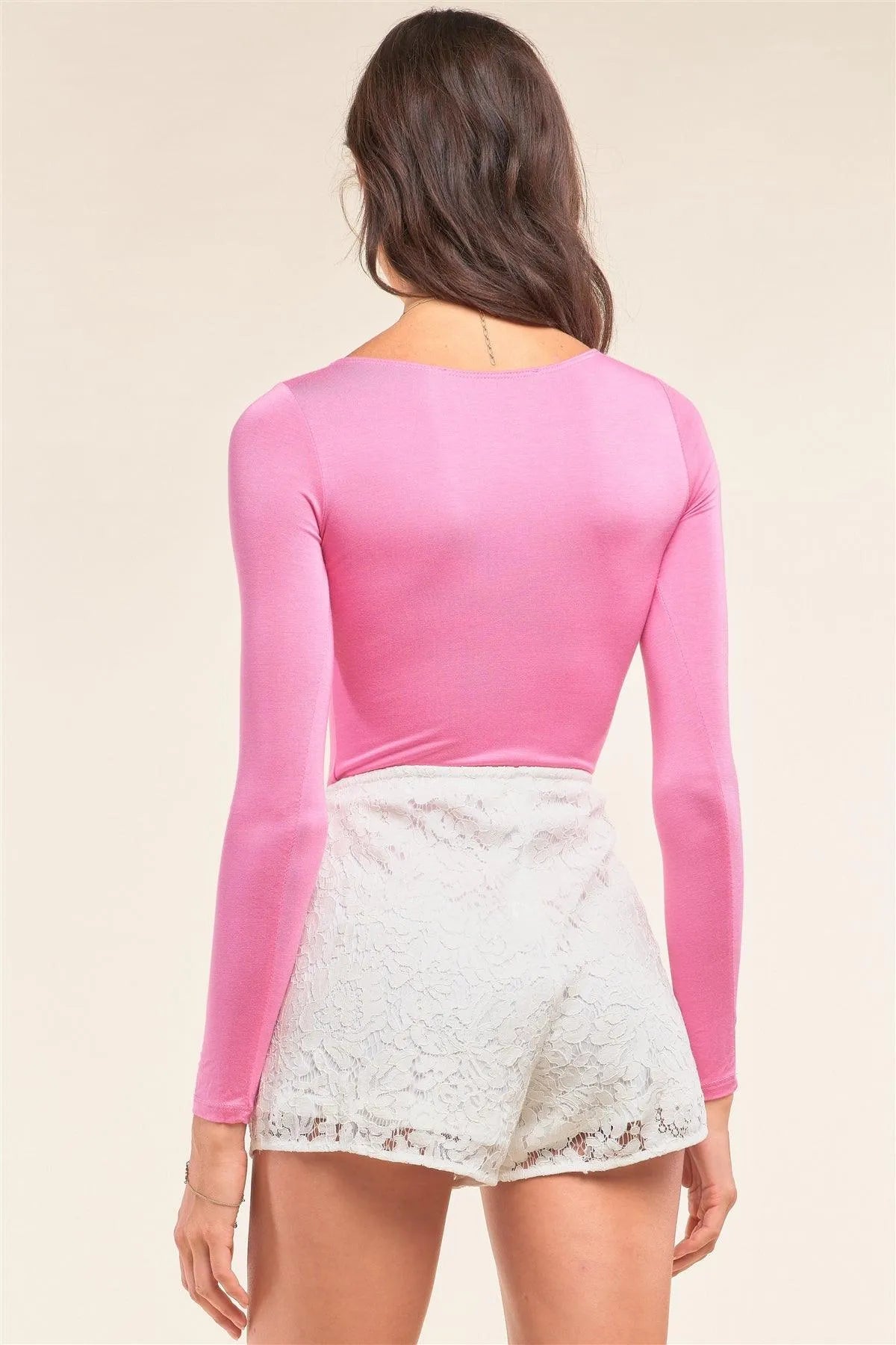 Pink Plain Tight Fit Long Sleeve Round Neck Bodysuit /2-2-2-1