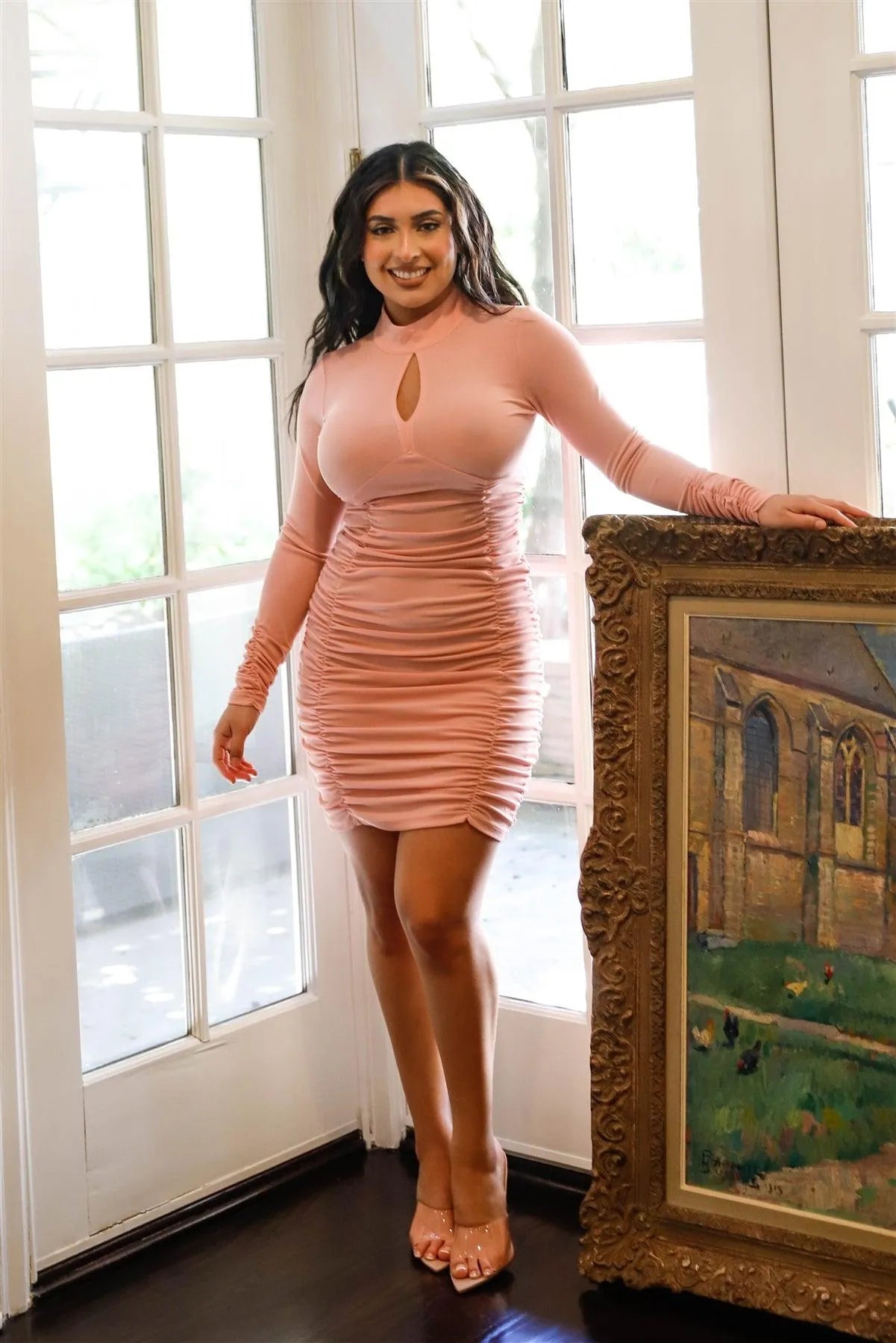 🖤 Item Features: Pink, solid color, ribbed material, ruched, front cut-out detail, mock neckline, back button loop closure, long sleeves, mini length, fitted, not see through, stretchy, unlined, hot, sexy, chic, elegant, trendy