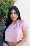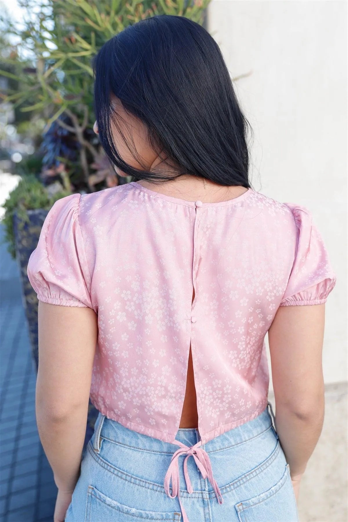 🖤 Item features: Pink, floral print, satin effect material, round neckline, puff balloon short sleeves with elasticized cuffs, back cut-out button closure details, back self-tie hem, cropped length, casual, cute, girlish, stylish, trendy, spring/summer look