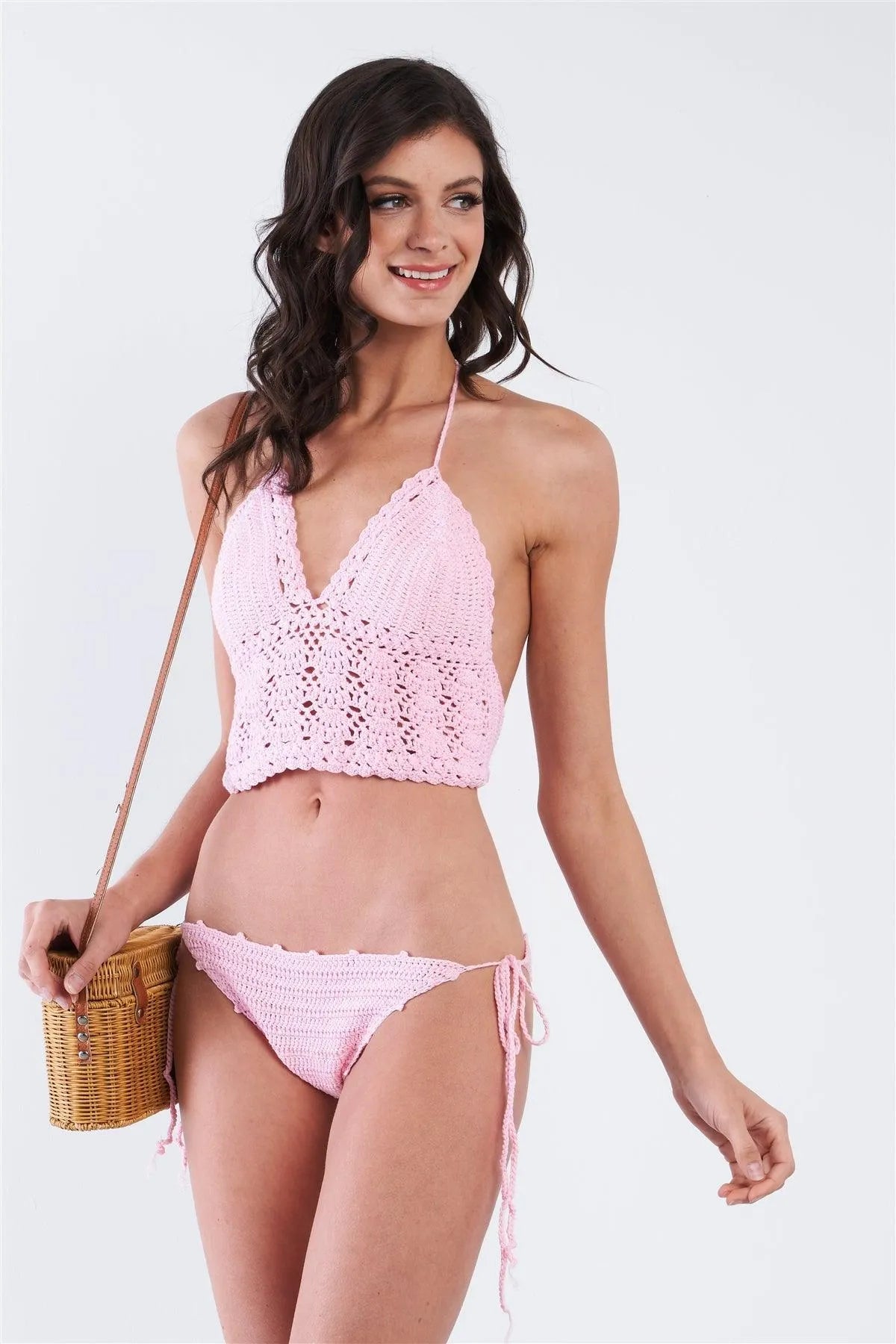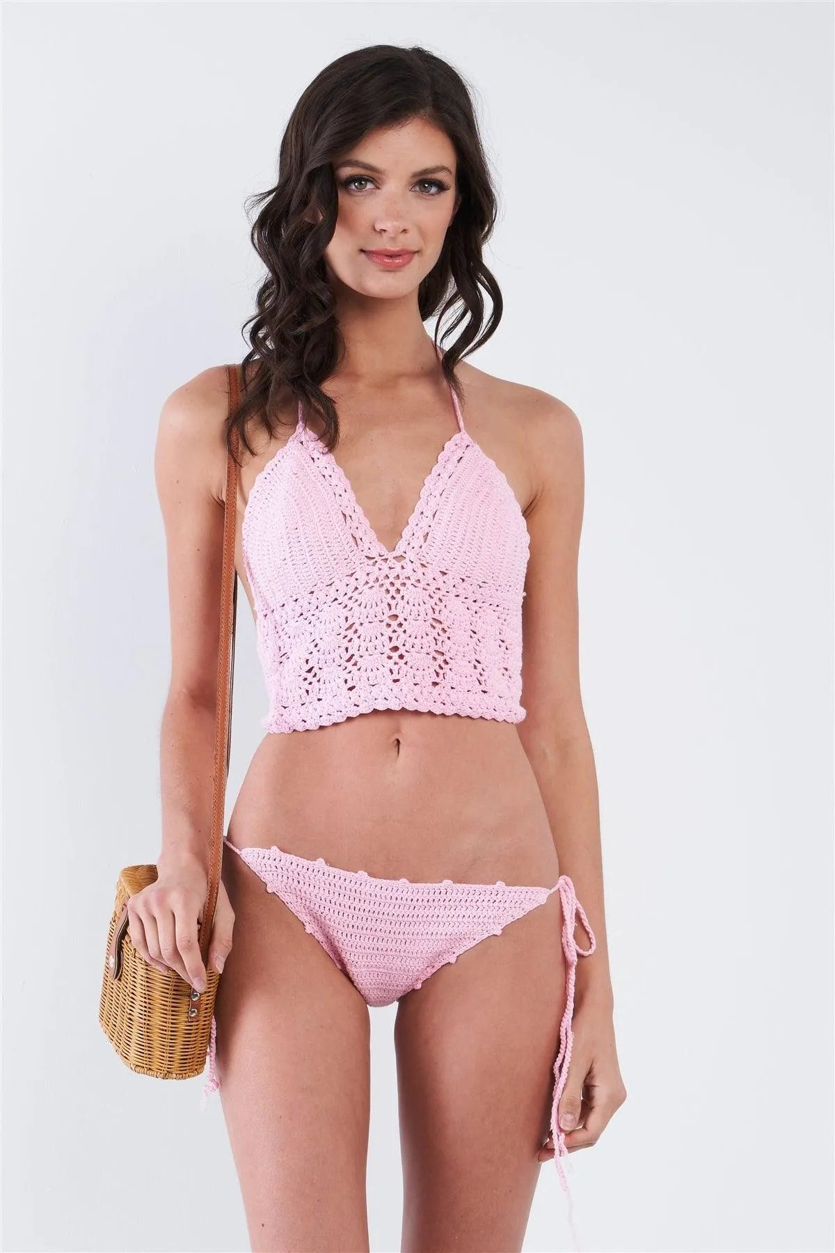 Take on any beach or festival with confidence in our Pink Self-Tie Halter Neck Crochet Two Piece Swimsuit. The bold, self-tie halter neckline and open back add a touch of adventure to the crop top, while the side self-tie closure and lined crotch area keep you secure while showing off your bohemian side. Perfect for summer and spring, this swimsuit is a must-have for those who like to take risks!