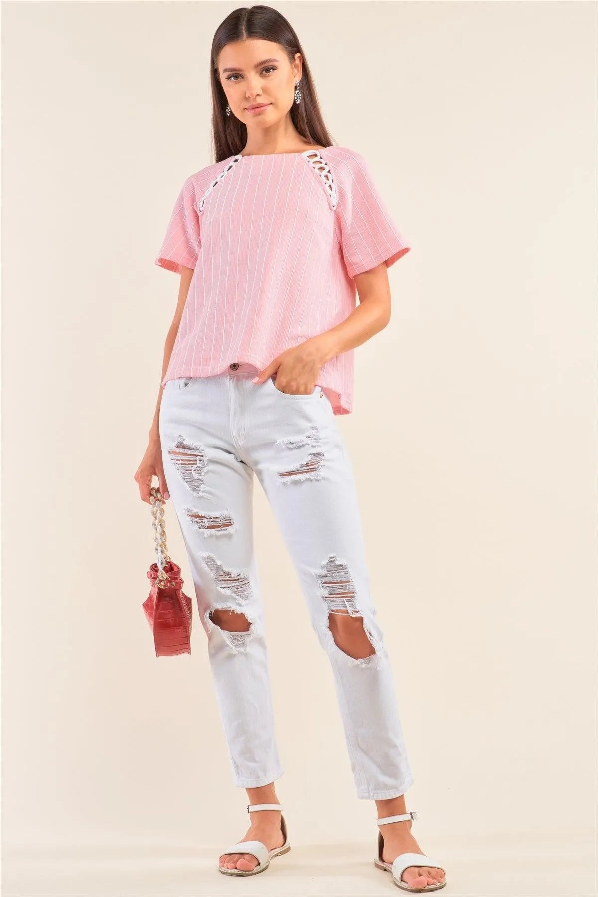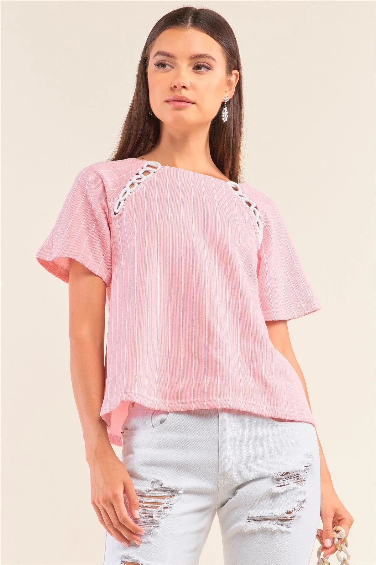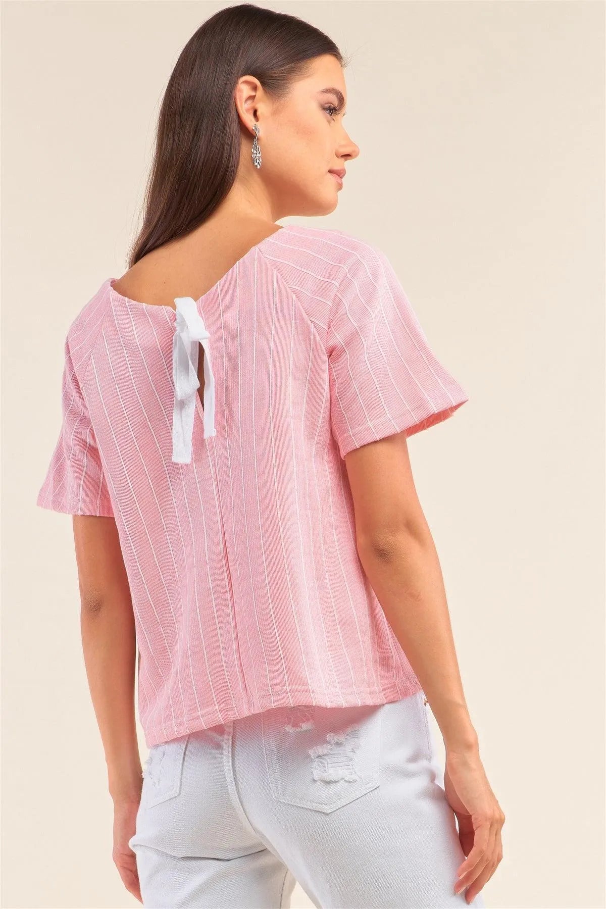 🖤 Item Features: Pink, white vertical stripe print, bootlace loop chest detail, short sleeve, relaxed fit, unlined, non-sheer, non-stretch, back self-tie neck detail, casual, breathable, comfy, cute, spring/summer collection