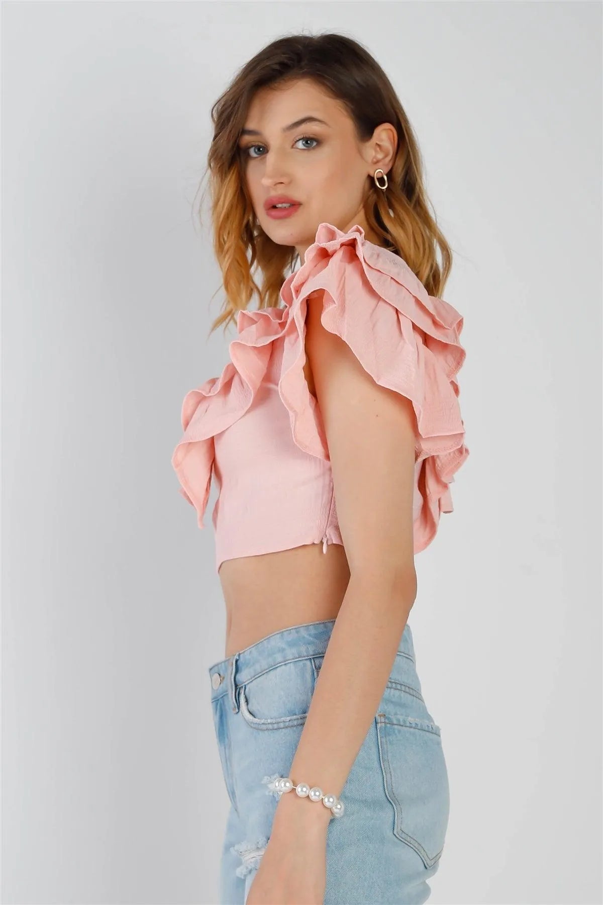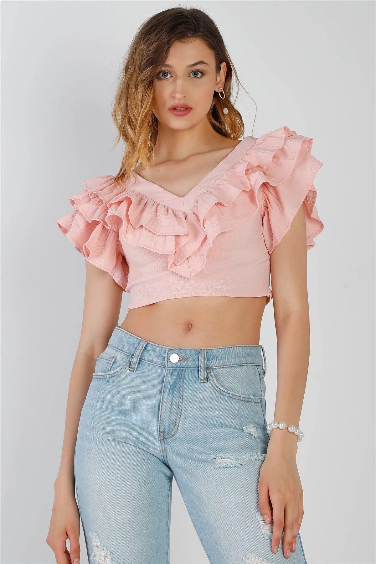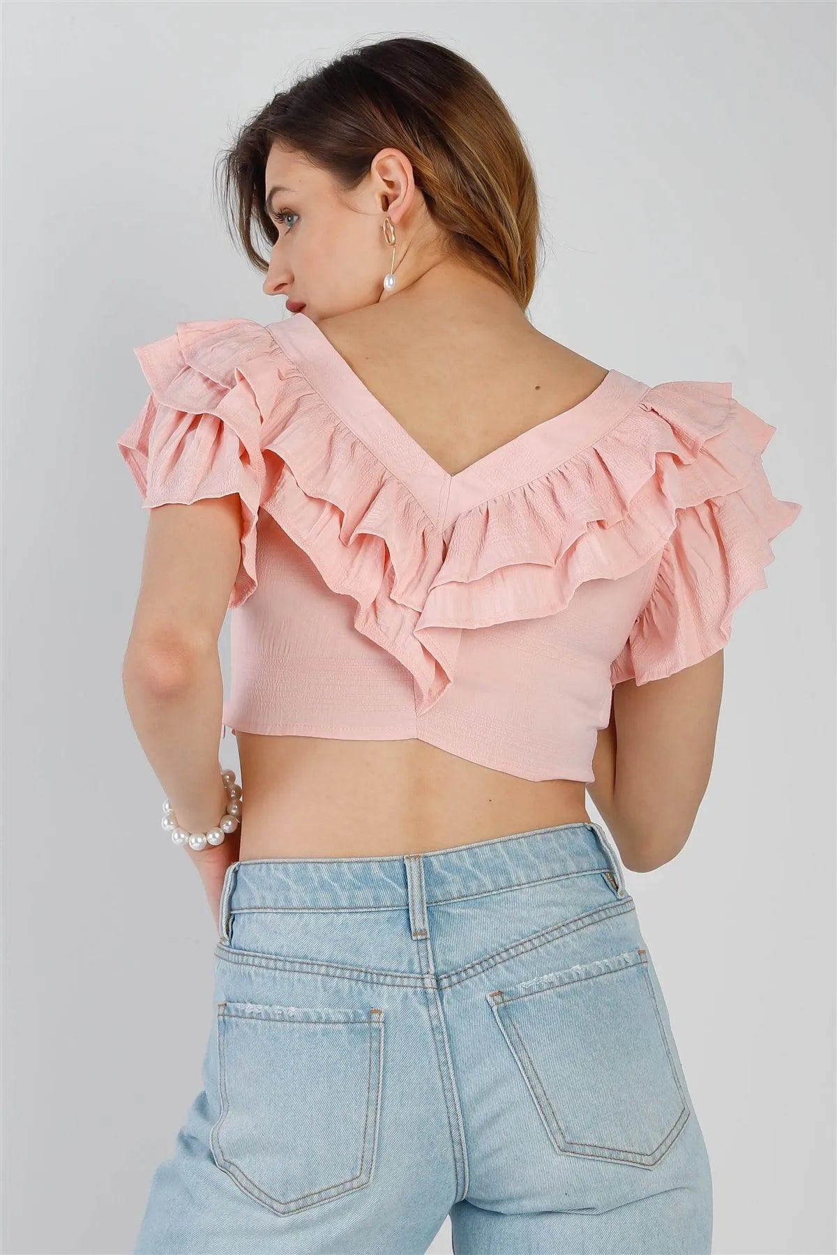 Pink Textured Layered Ruffle Detail V-Neck Crop Top /2-2-2