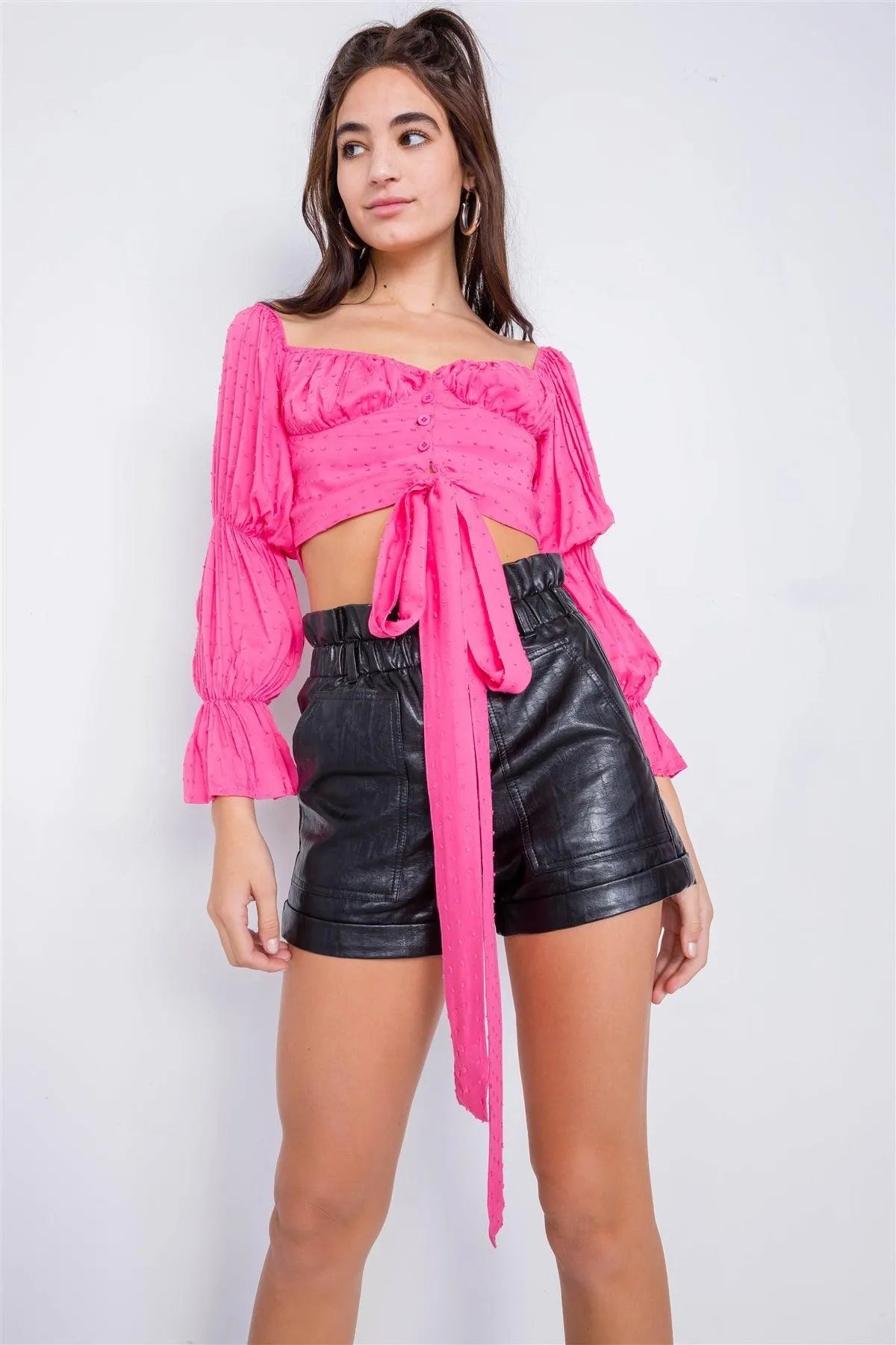 Pink Tiered Puff Embroidered Boho Knot Wrap Crop Top /2-1-1
