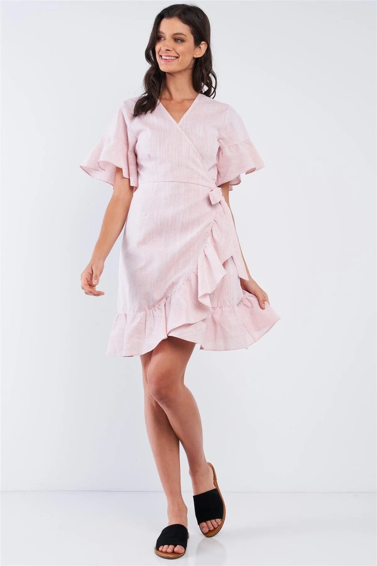 Pastel Pink Deep Plunge V-Neck Ruffle Hem Self-Tie Waist Wrap Mini Dress