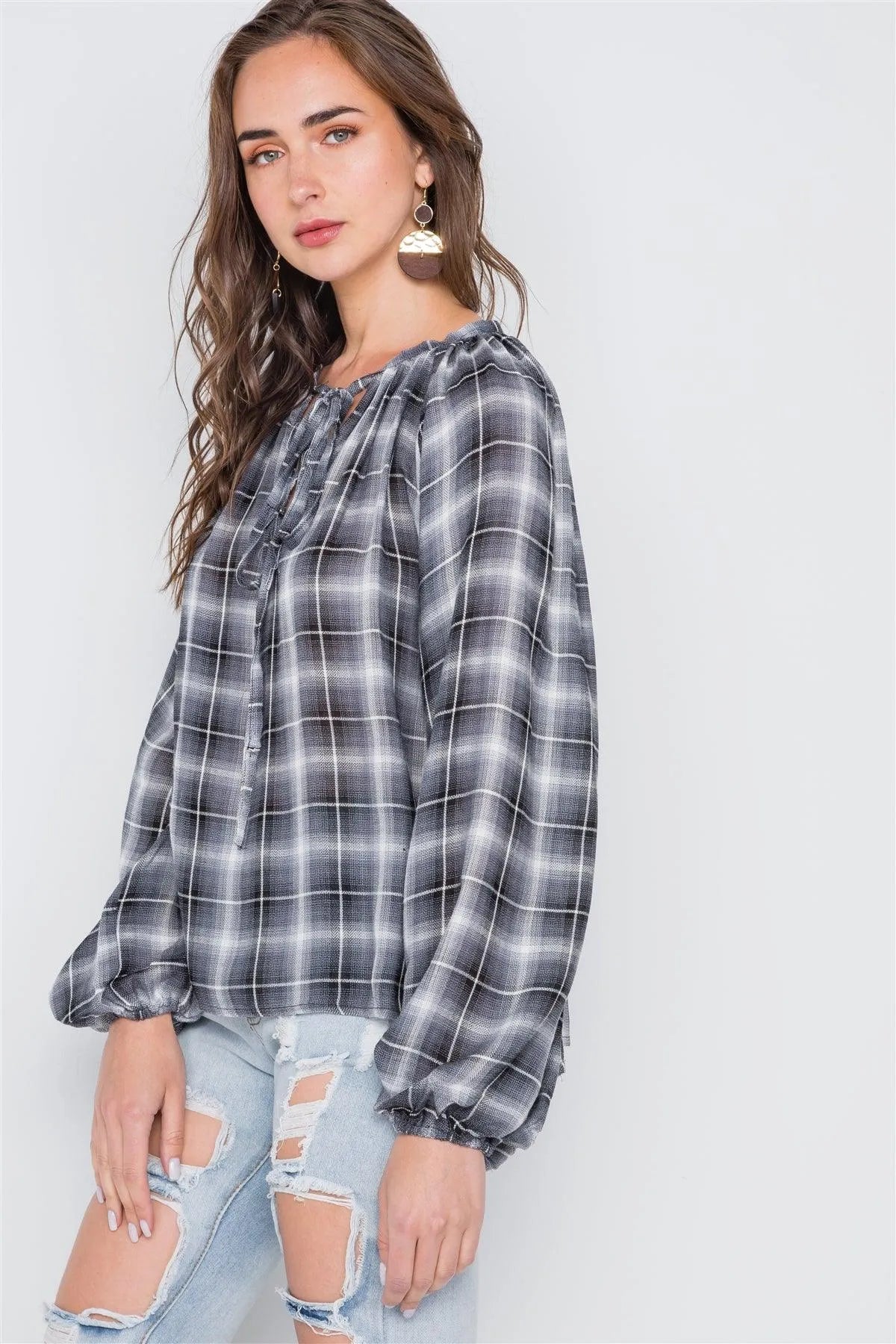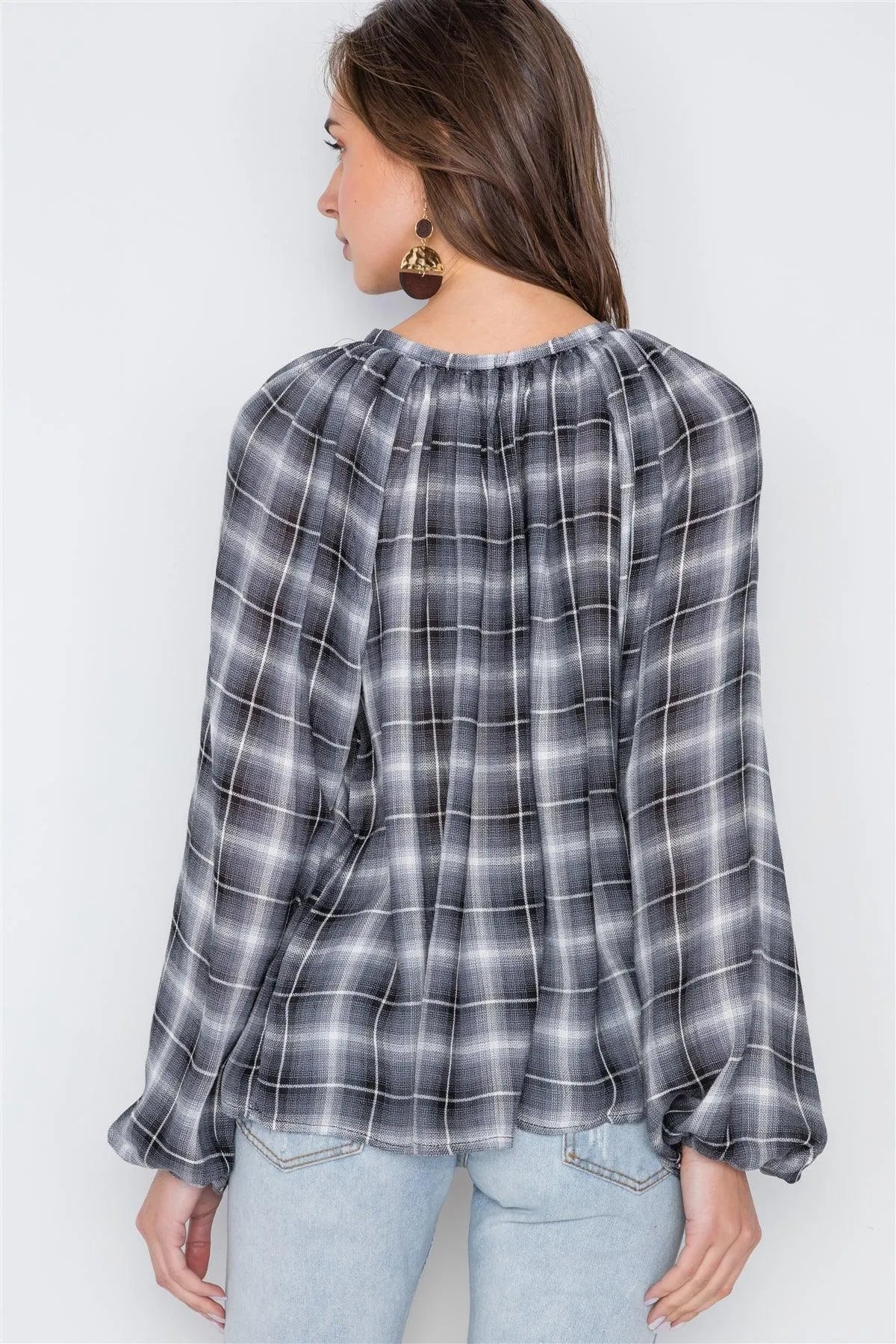 Plaid Black White Long Sleeve Self Tie Top /2-2-2