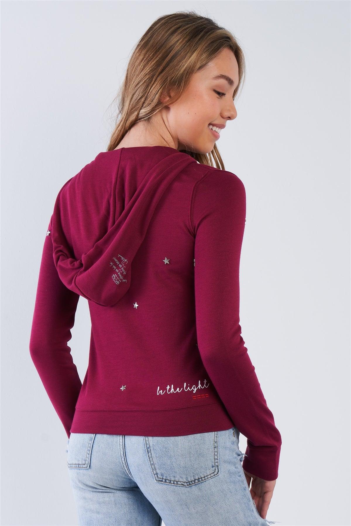 Plum Long Sleeve "Be The Light" Graphic Star Studded Comfy Zip Up Hoodie /2-2-1-1