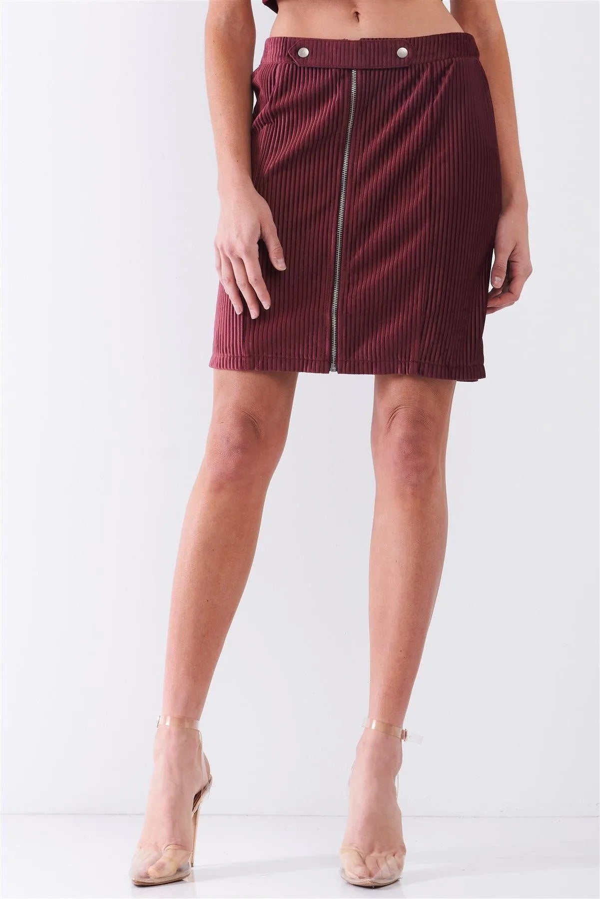 Plum Velvet Ribbed High Waist Front Zip-Up Detail Tight Mini Skirt /1-2-2-1