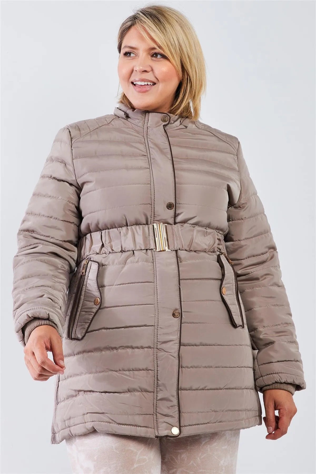 Junior Plus Beige-Grey Parallel Quilt Faux Fur Hood Belted Padded Long Puffer Jacket /2-3