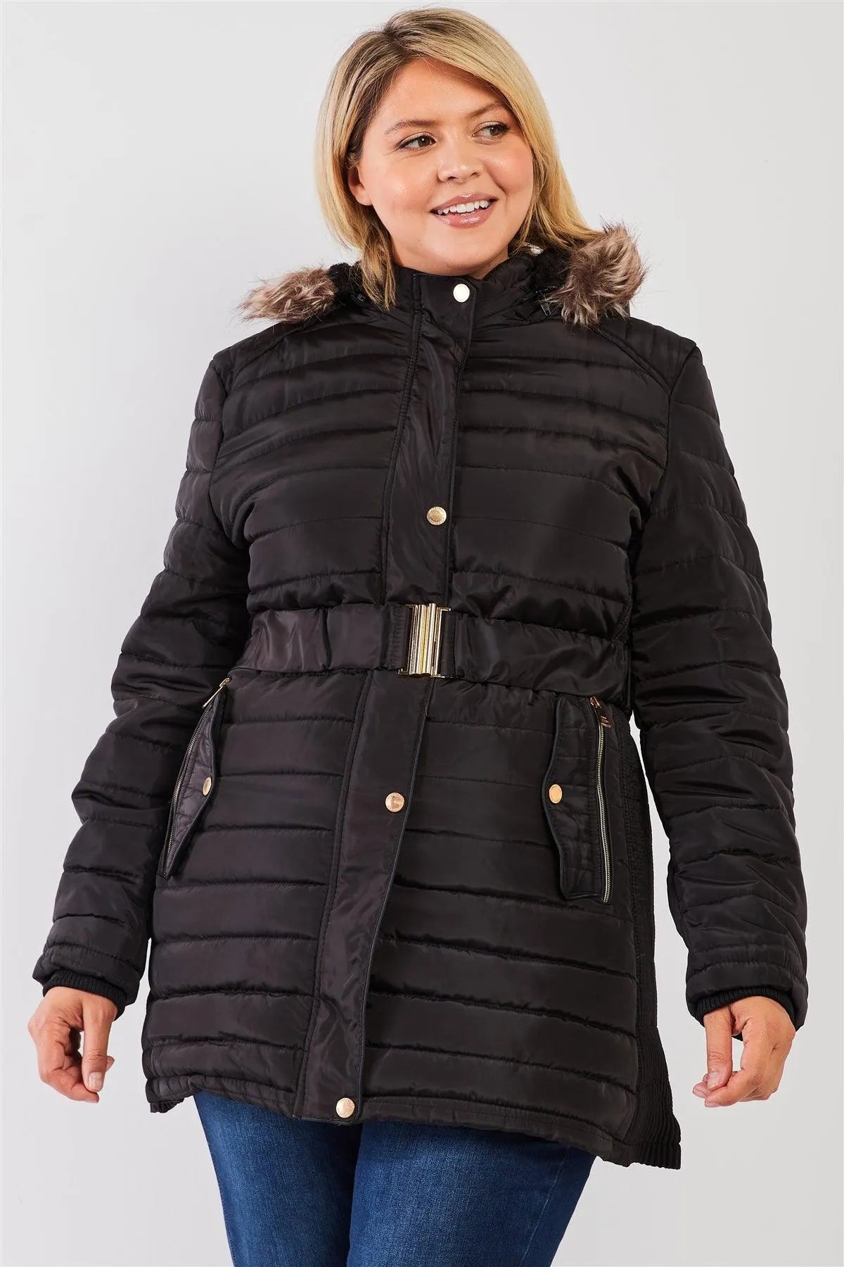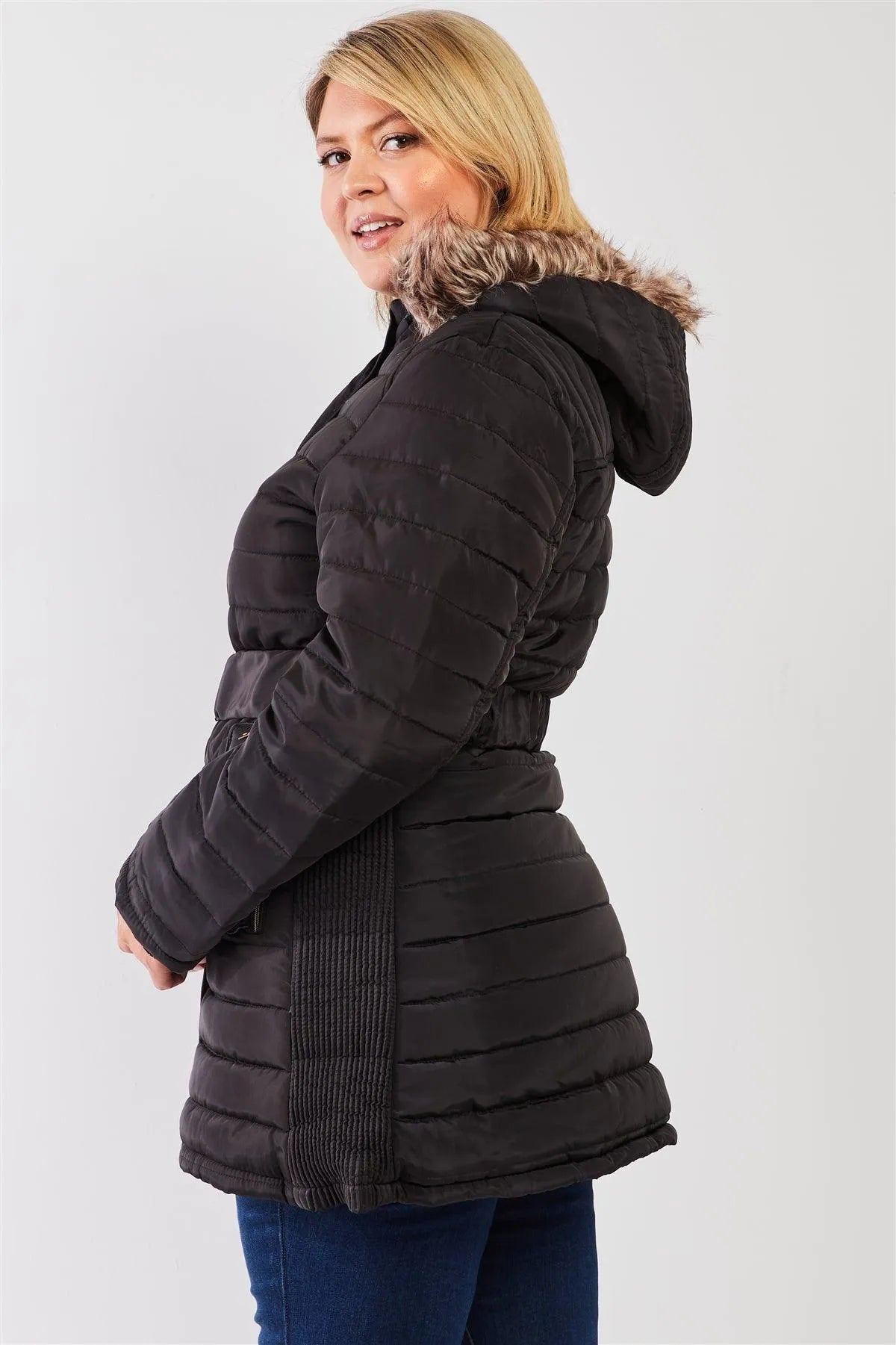 Junior Plus Black Parallel Quilt Faux Fur Hood Belted Padded Long Puffer Jacket /1-3-2