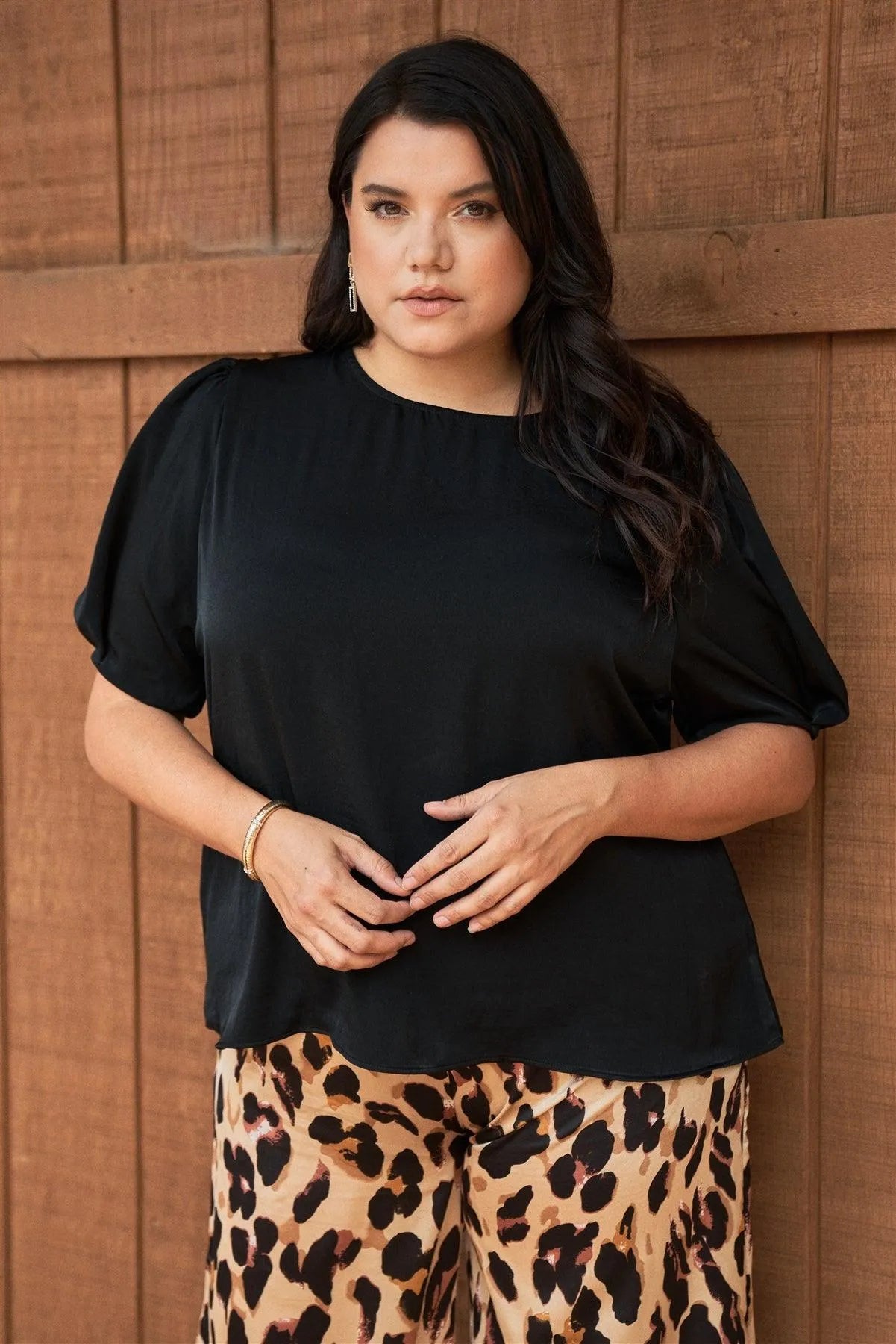 Plus Size Black Satin Round Neck Short Sleeve Top /3-2-1