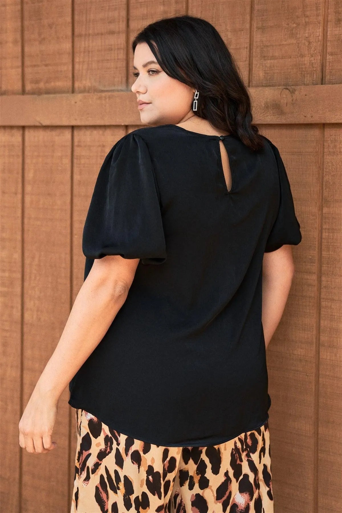 🖤 This elegant black satin top flaunts a solid color and short puff sleeves for a unique holiday outfit. The loose fit and round neckline add a casual touch, while the back keyhole closure ensures a secure fit. Non-stretch and unlined, this top pairs perfectly with our Taupe Combo Leopard Print Satin Pants.