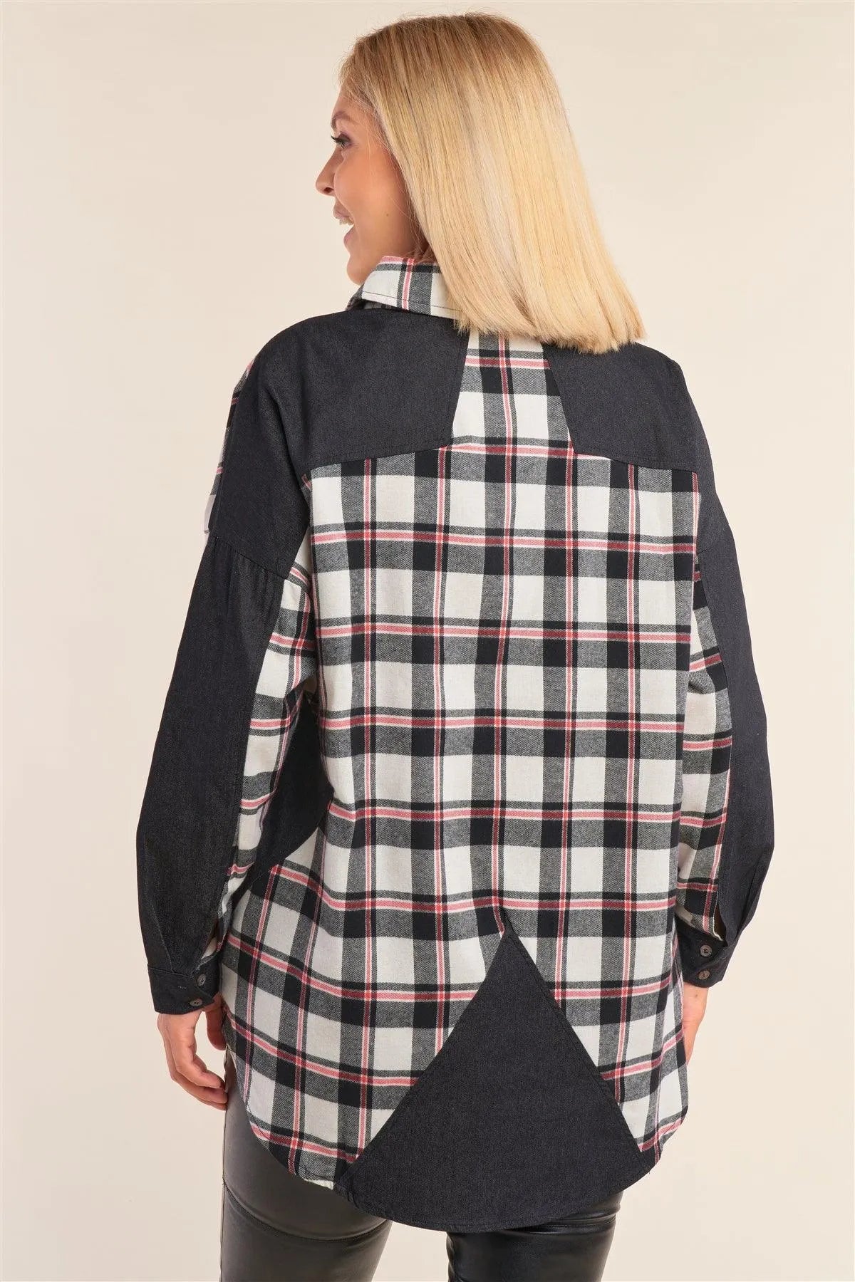 🖤 Item features: Ivory, checkered print, button down, black denim-like cut-in details on the back and sleeves, two front chest pockets, asymmetrical bottom hem, collared, unlined, non-stretch, casual, cozy, stylish, trendy, fall/winter season