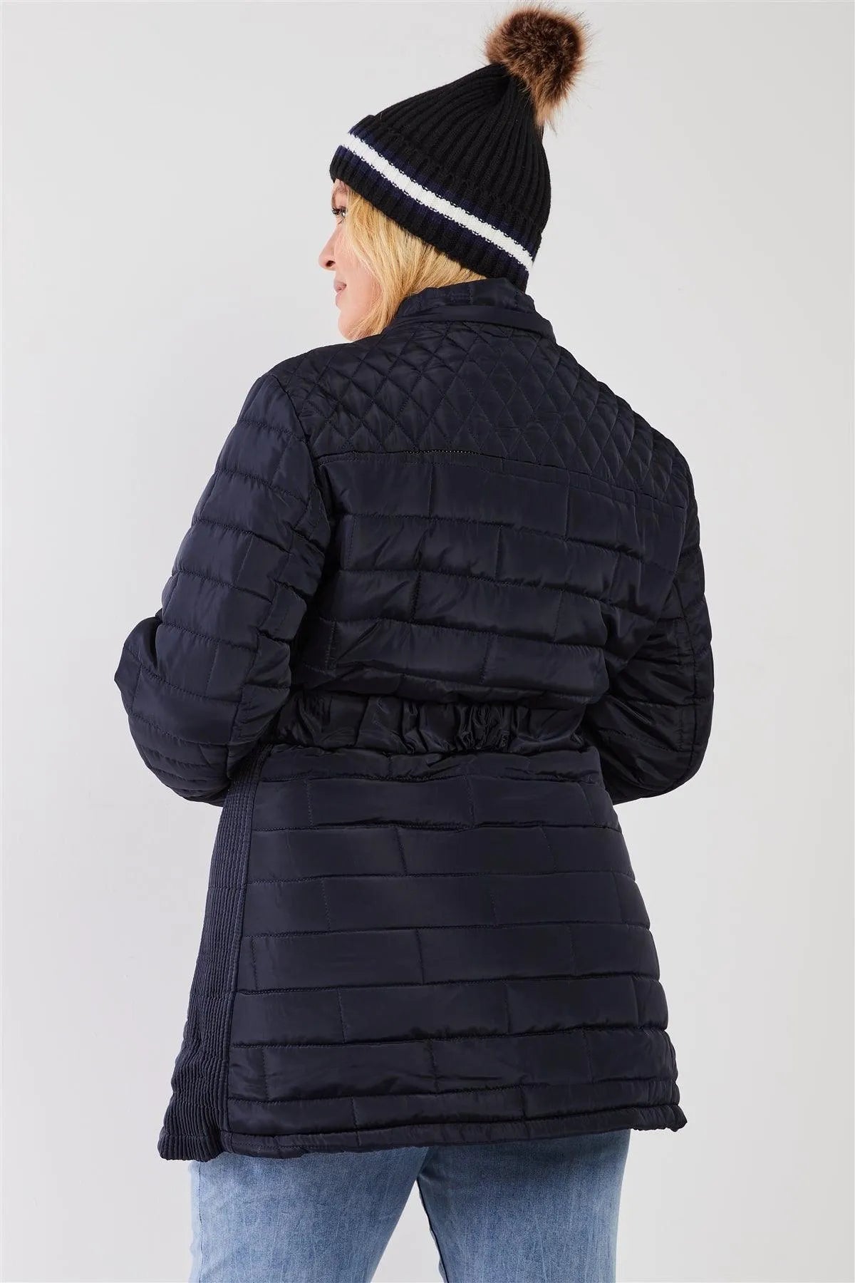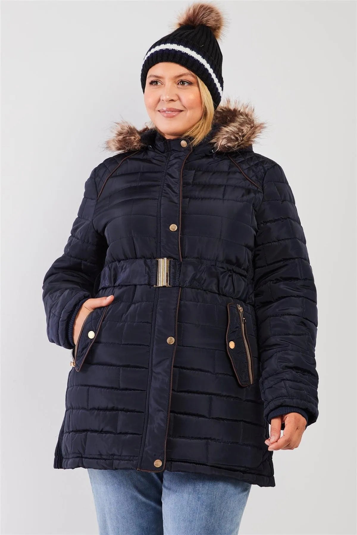 Junior Plus Navy Diamond Quilt Faux Fur Hood Belted Padded Long Puffer Jacket /1-1-1-1