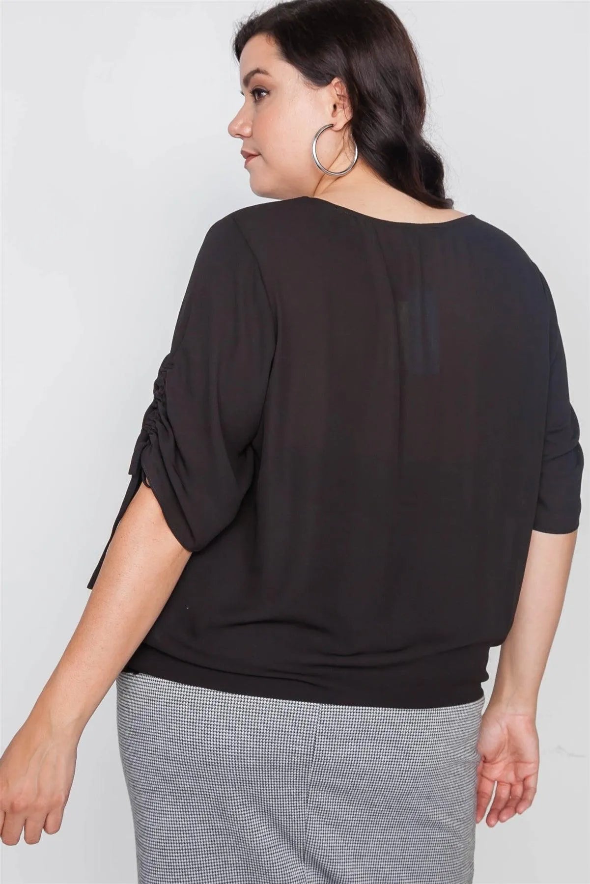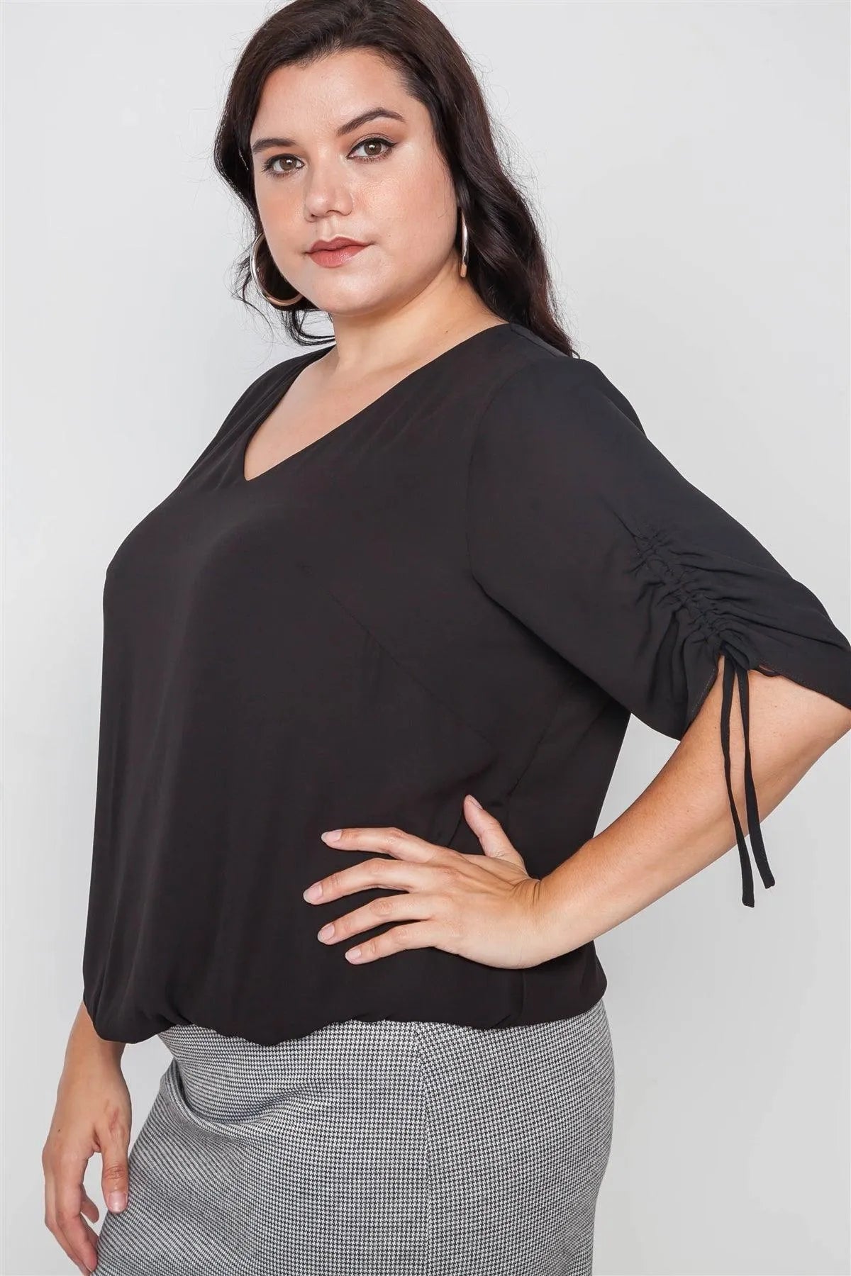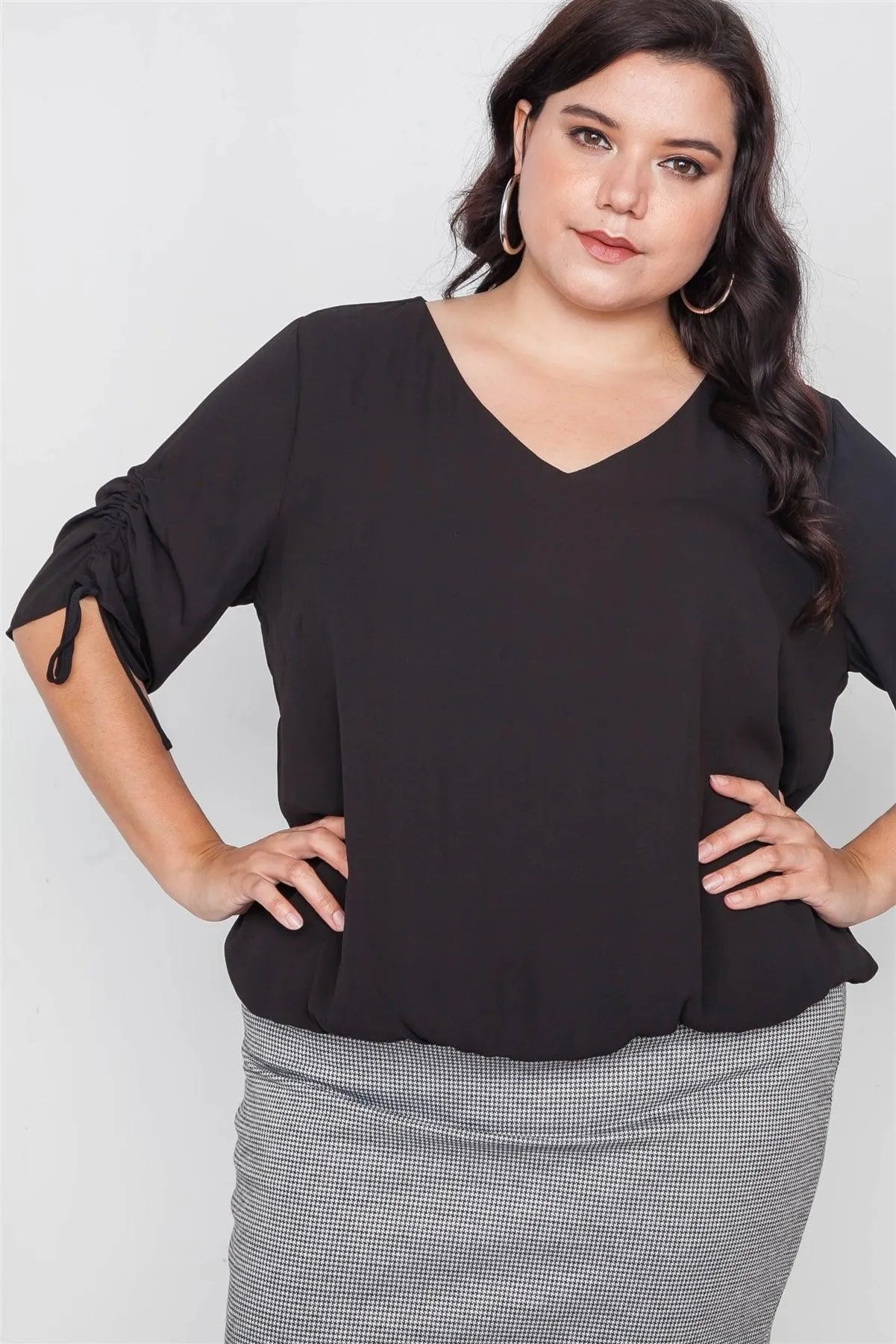 Plus Top featuring: 3/4 sleeves with adjustable strings, V-Neck, elasticized hem, linedModel is 5'6 and wearing a 1X ( Bust: 42C", Waist: 35", Hips: 47")Item Measurements: Length: 26", Bust: 50", Sleeves: 13"True to size