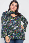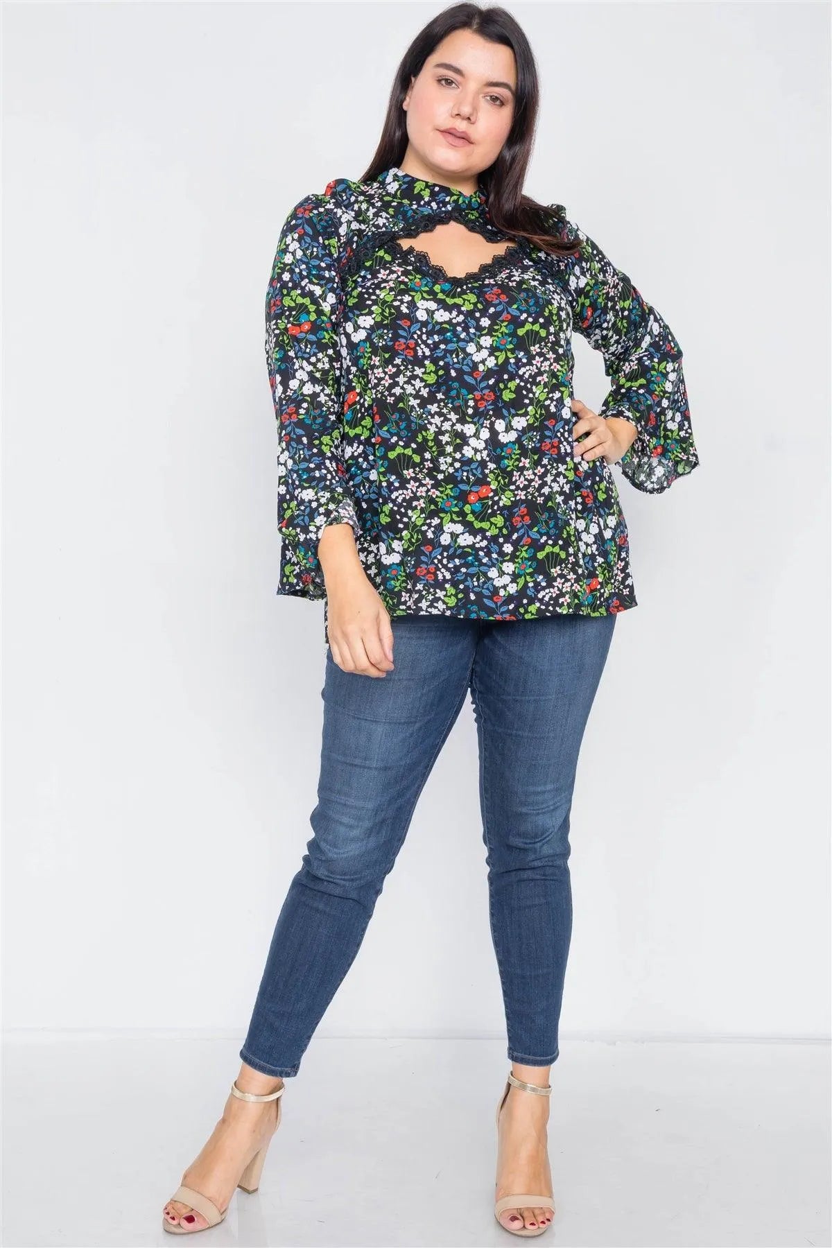 Top features: front keyhole lace trim cut out, white blue red and purple floral print, mock neck, back button closure, back keyhole cut out, bell sleeve, unlined, some stretch. Model is 5'6 and wearing a 1X ( Bust: 38DD", Waist: 39", Hips: 50")Top Measurements: Length: 29" Sleeves: 23" Bust: 44"True to sizeAlso available in Mustard
