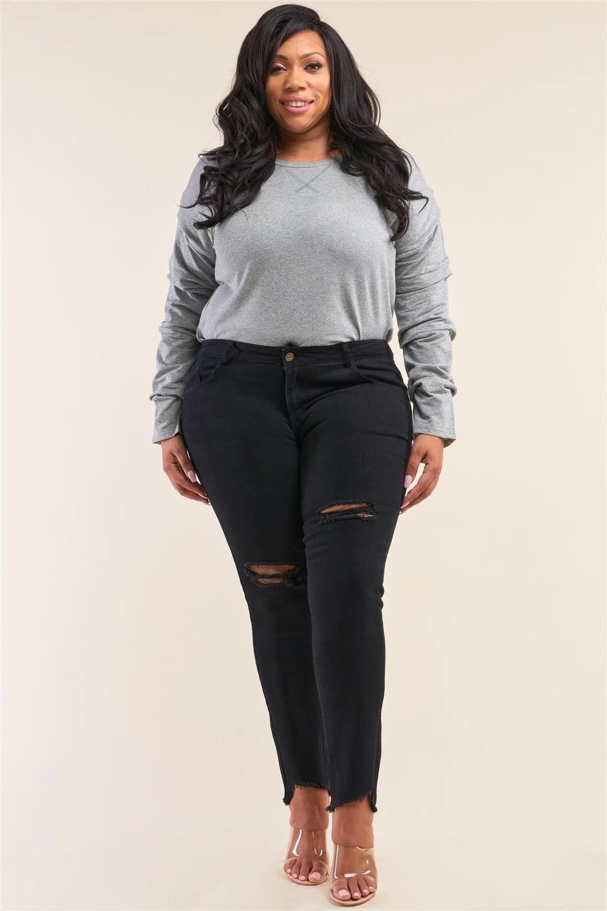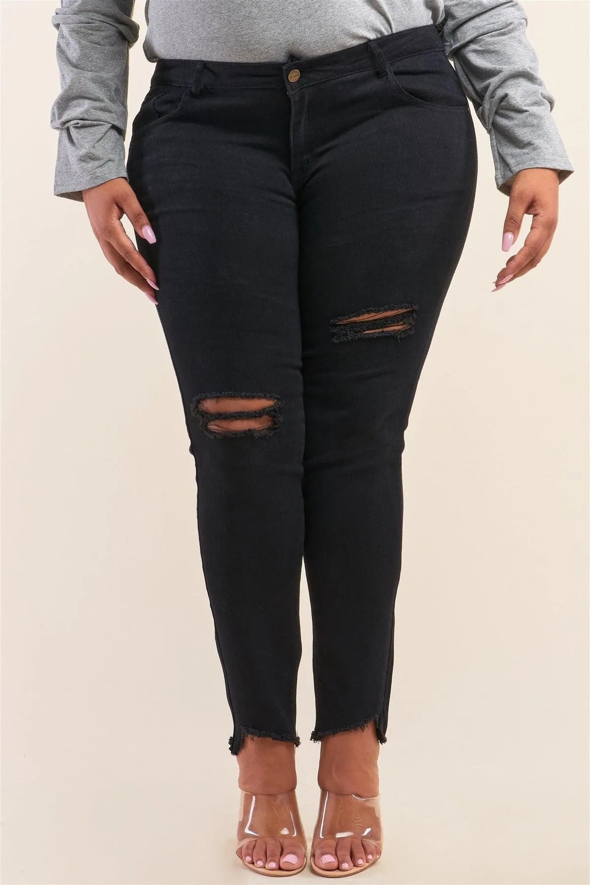 Plus Size Solid Black Low-Mid Rise Tight Fit Ripped Denim Jeans /1-2-3-3-2-1