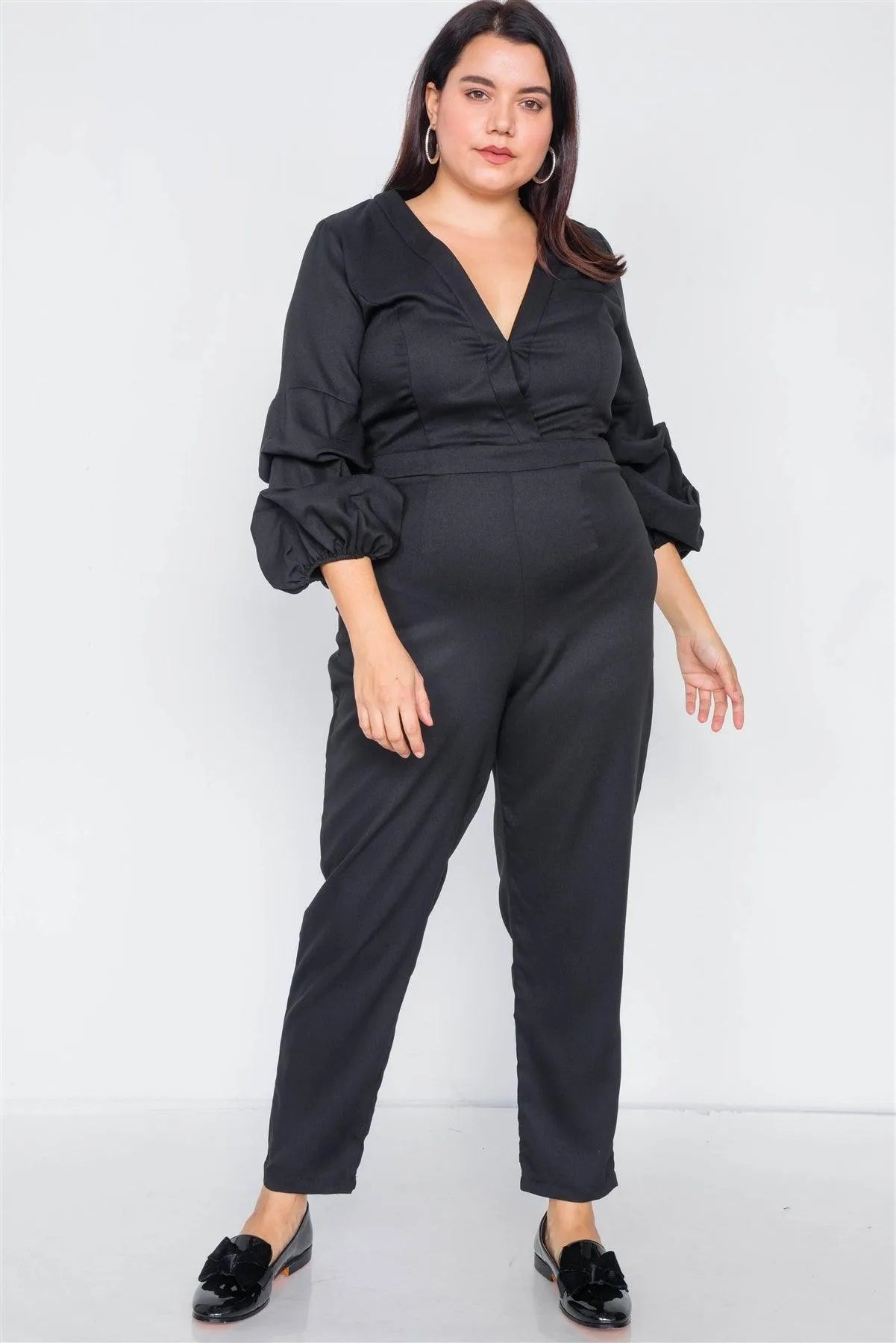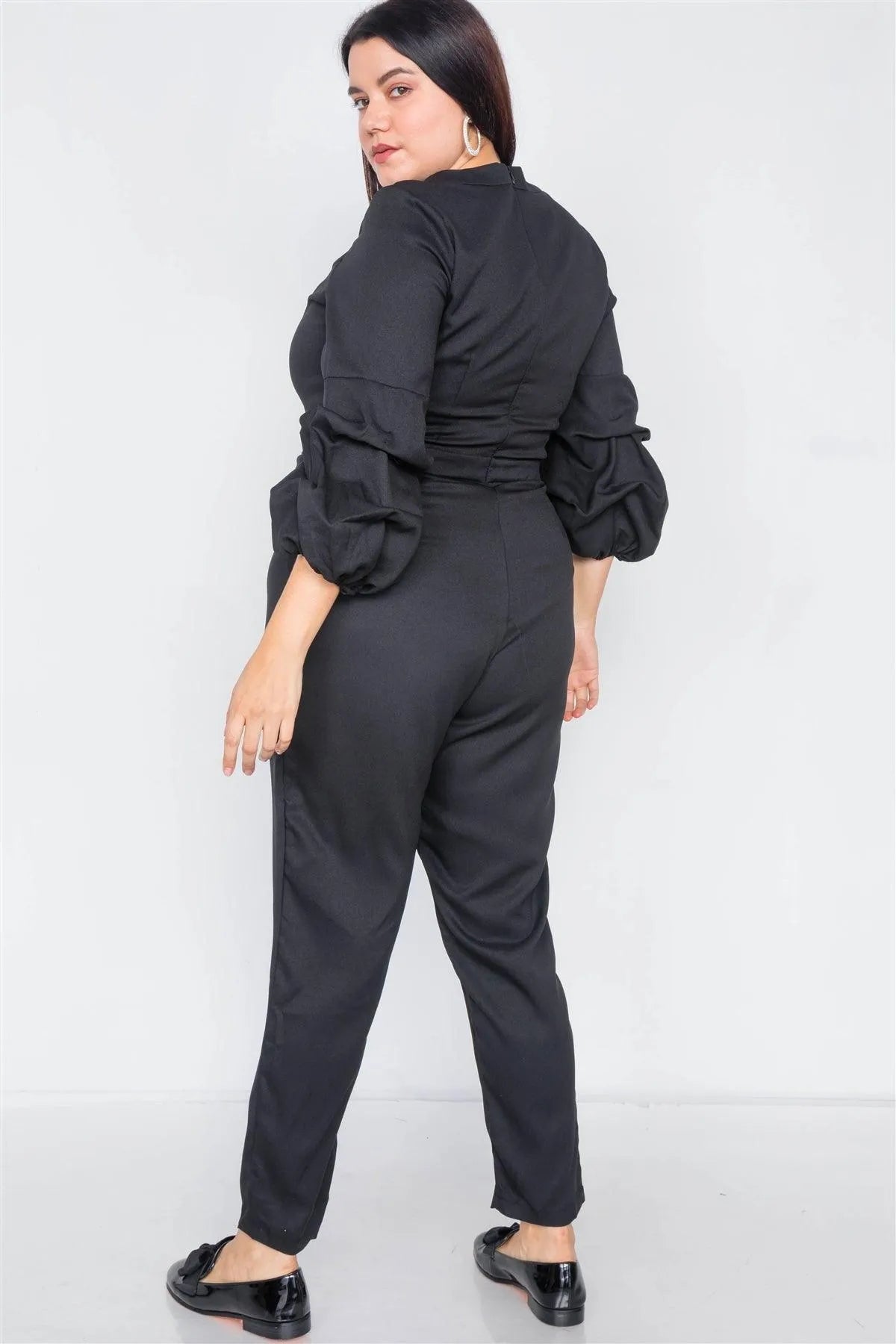 Plus Size Black V-Neck Puff Sleeve Straight Leg Jumpsuit